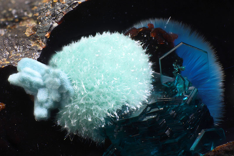 Blassgrünes kugeliges Aggregat im Vordergrund: vermutlich Malachit.