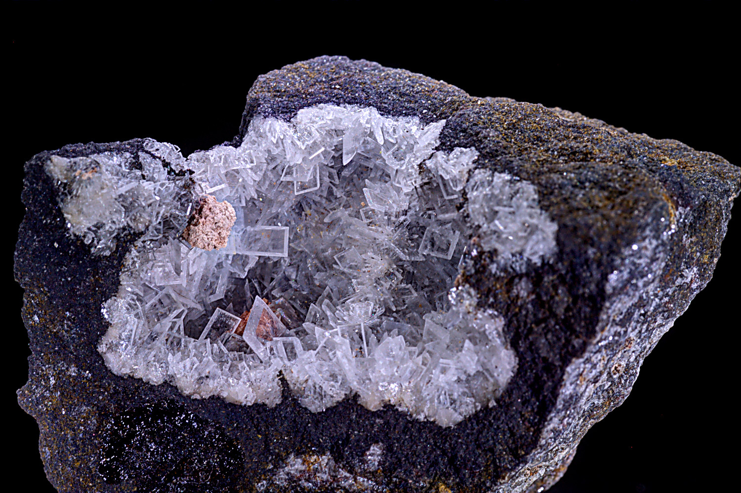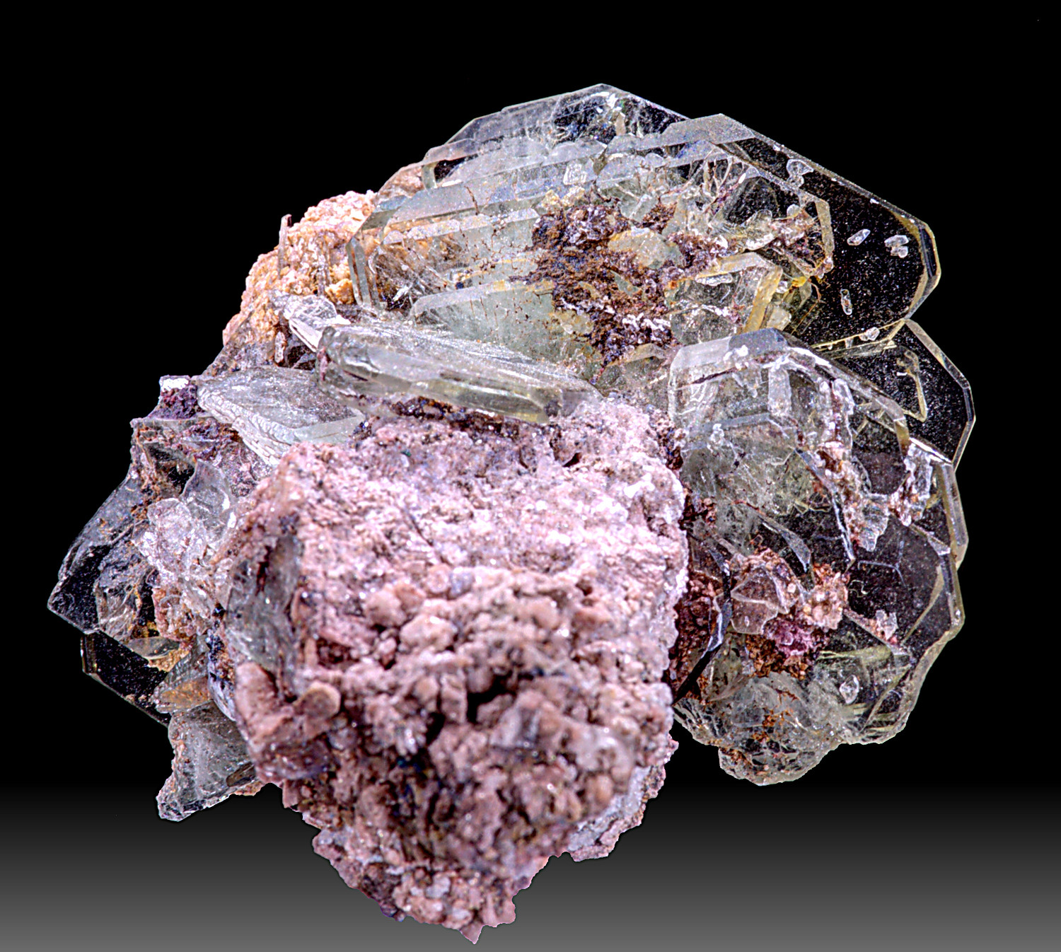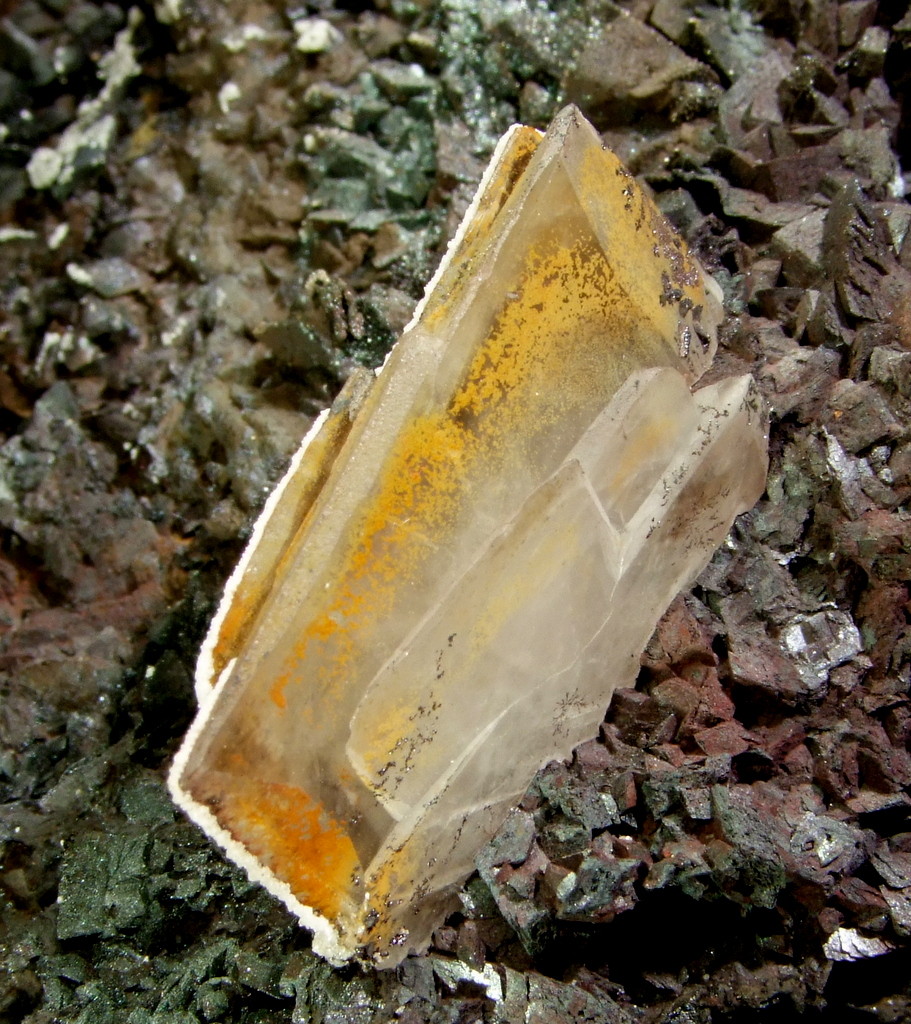 hatten wir zwar schon , aber Baryt aus der Grube Clara ist recht vielfältig. In diesem Fall sitzt der vollständig transparente Baryt x auf einem Fluorit x, der wiederum mit Goethit überzogen ist.
