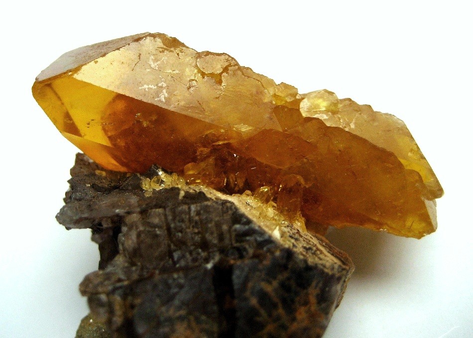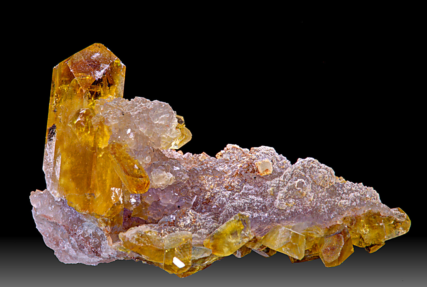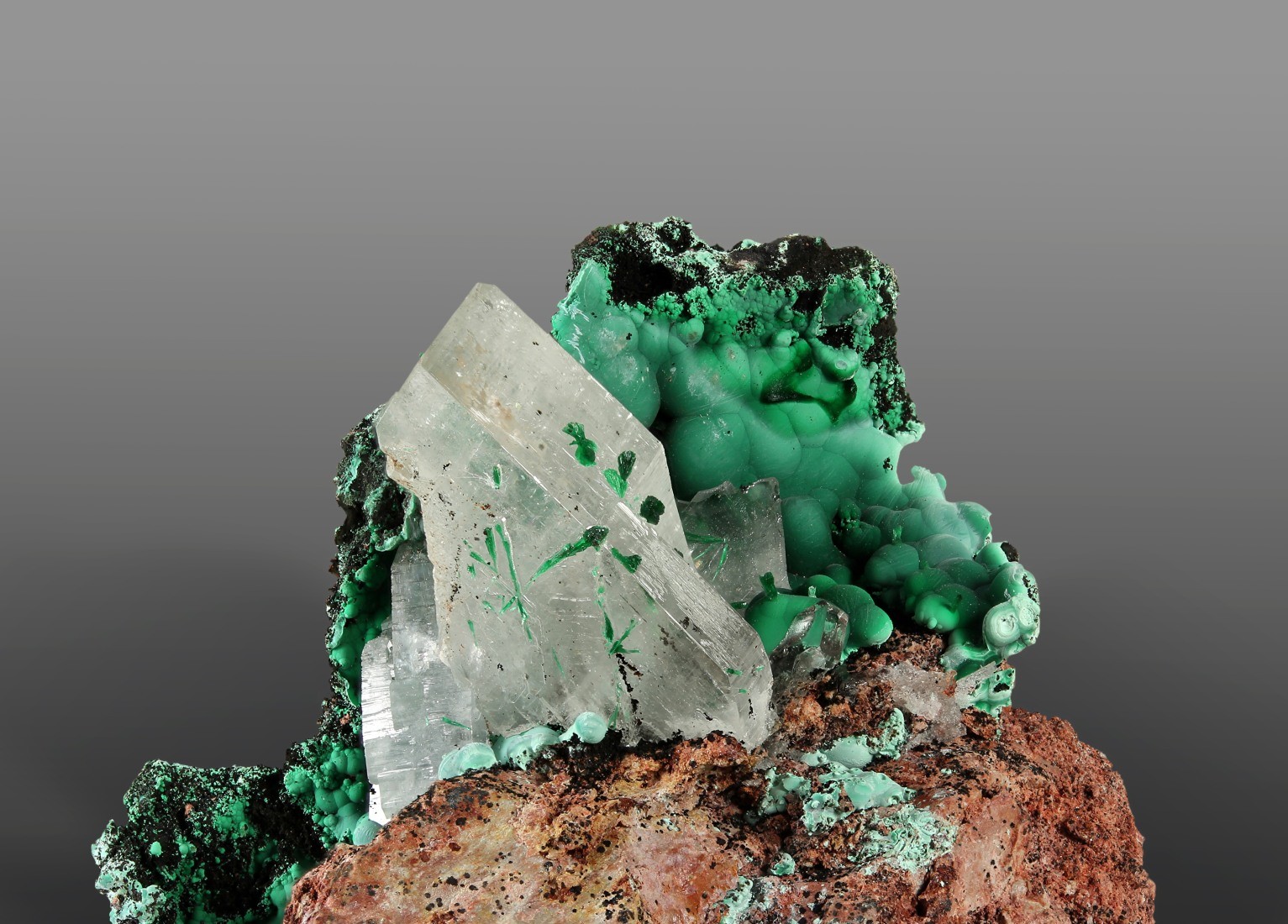 hatten wir zwar schon , aber Baryt aus der Grube Clara ist recht vielfältig. In diesem Fall sitzt der vollständig transparente Baryt x auf einem Fluorit x, der wiederum mit Goethit überzogen ist.