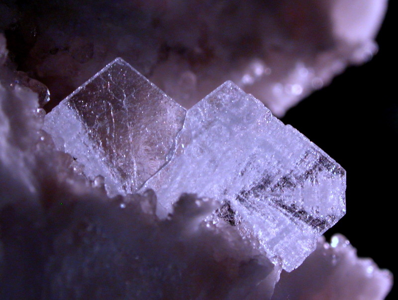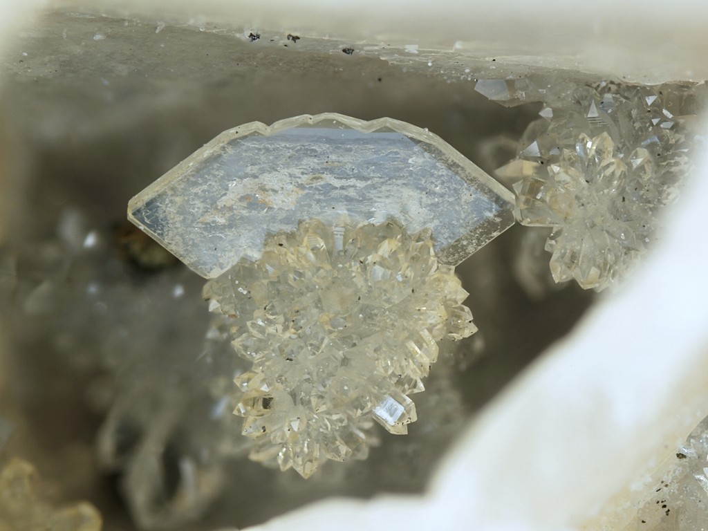 Bild 2: transparenter Barytschwimmer, teilweise mit einem Rasen von kleinsten Stilbitkristallen überwachsen