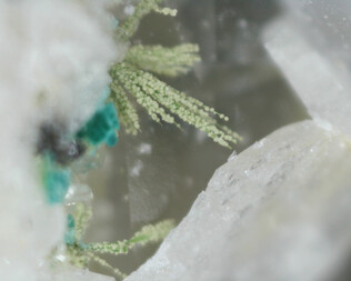 Grube Clara, olivgrün, klar, Blättchen/Rosetten, winzigkleine Kristalle, zusammen mit Bario-Pharmakosiderit ...
