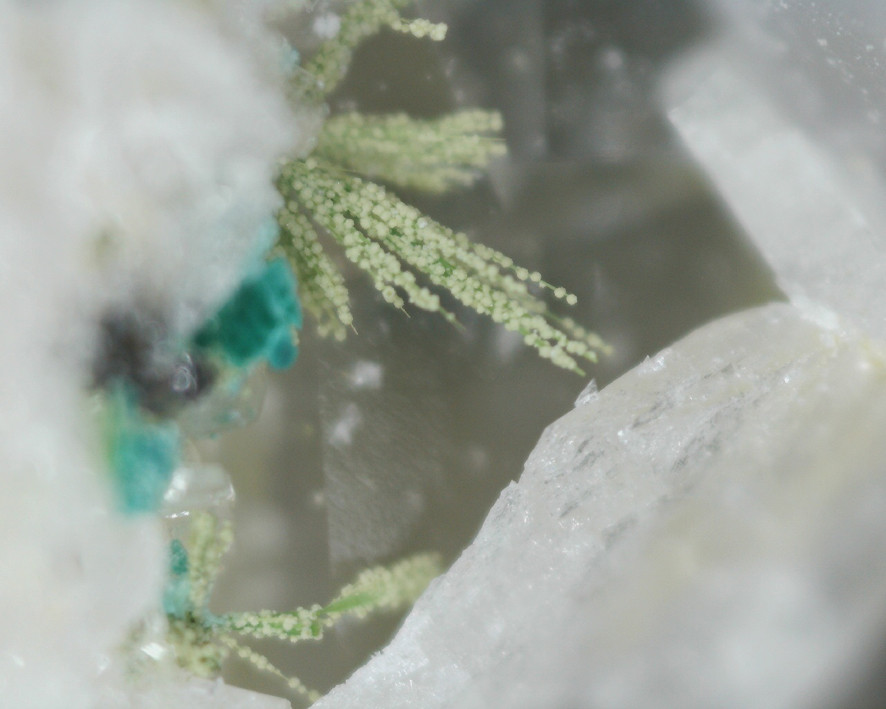 Cremfarbene Kugeln auf Olivenitnadeln in Baryt - Fluorit Druse