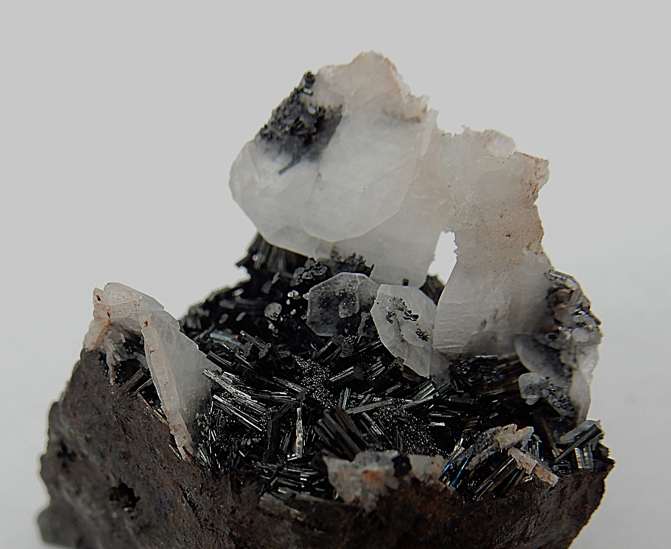 In einer Druse, die von Manganit umgeben ist, befinden sich weißbraune,stengelige, sehr stark glänzende xx (Glasglanz), diese können