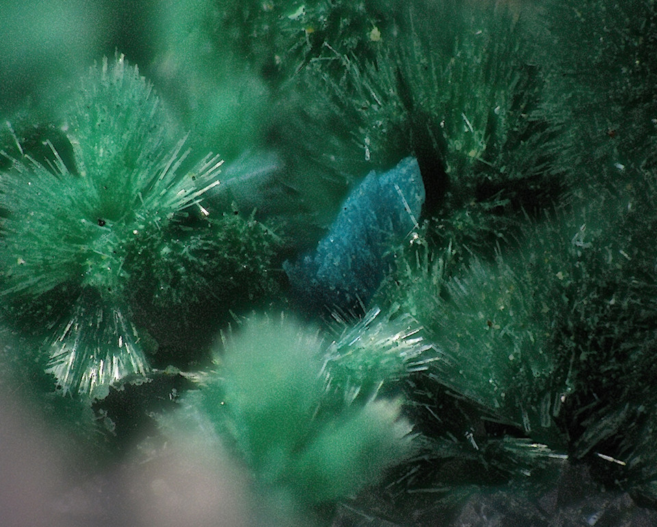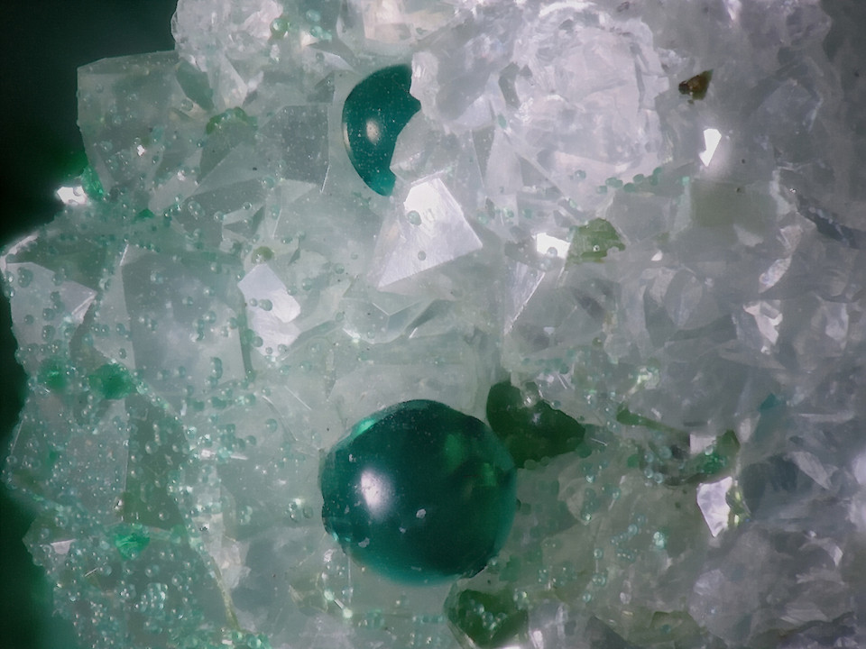 6. Mineral: Zwischen grünen Corwallitkristallen sind hellblaue kugelige durchscheinende Kristalle auf Quarz.