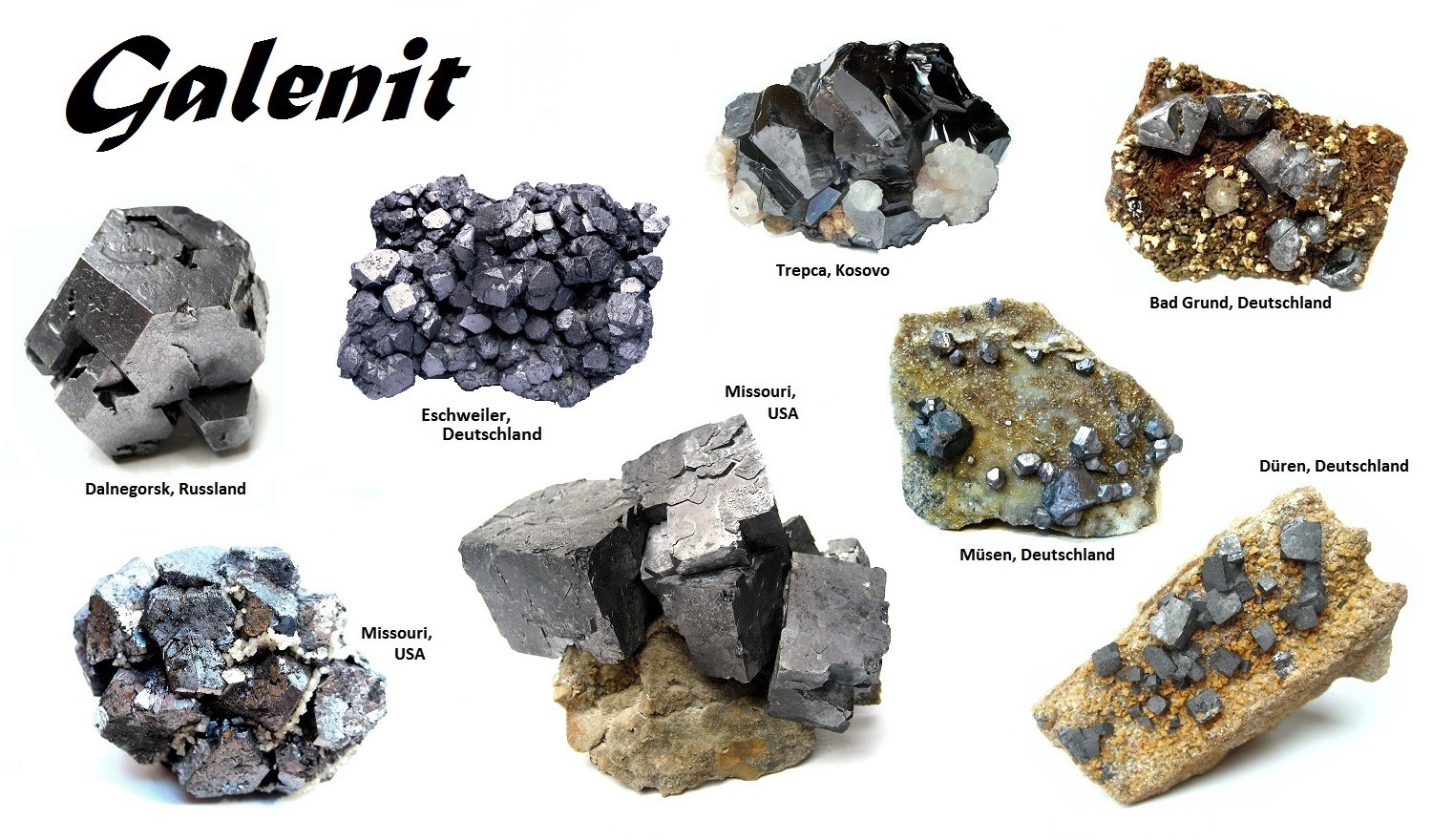 ich habe vor einiger Zeit mal angefangen, aus Spaß ein paar Mineraliencollagen anzufertigen; meist widmen sie sich einem bestimmten Mineral, einer Mineraliengruppe oder einem Land bzw. Fundort. War eigentlich nur eine Spielerei, aber einige Leute fanden es gut und ermunterten mich, weitere solcher Collagen zu erstellen. Ich werde einige an dieser Stelle vorstellen und bin mal auf Meinungen dazu gespannt. Los geht's mit dem wunderschönen Mineral Galenit: