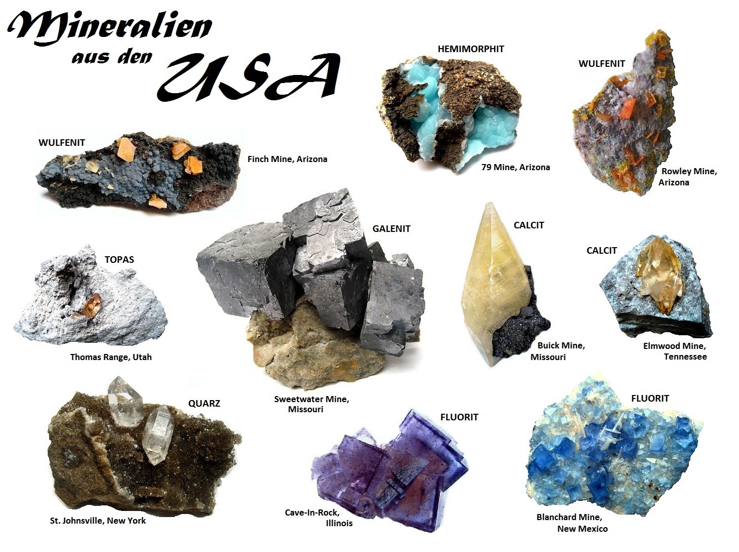 Wie schon gesagt, natürlich könnte man da noch Größenangaben einfügen; aber ich habe ohne angefangen und werde auch die anderen Collagen so fortführen. Wer wissen will, wie groß die Stufen jeweils sind, dem empfehle ich http://www.mindat.org/user-5297.html#2, dort kann man mit Suchbegriffen jede Stufe schnell finden :)