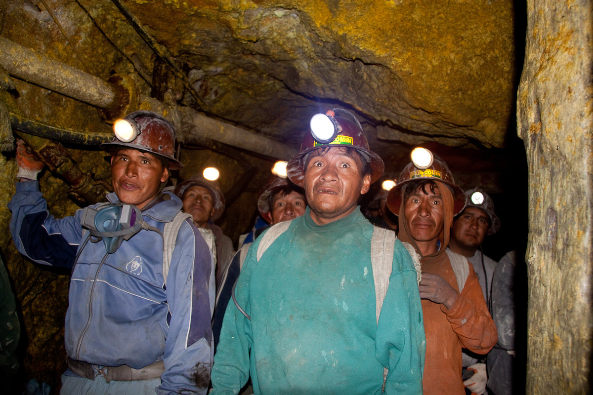 Der Fotograf steht im Grubenaufzug und fährt an den Bergleuten im Stollenabzweig vorbei...passt doch