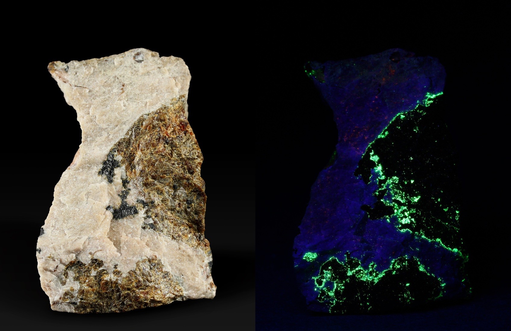 Willemit und Calcit fluoreszieren auch unter LW-UV, aber anders und schwächer.