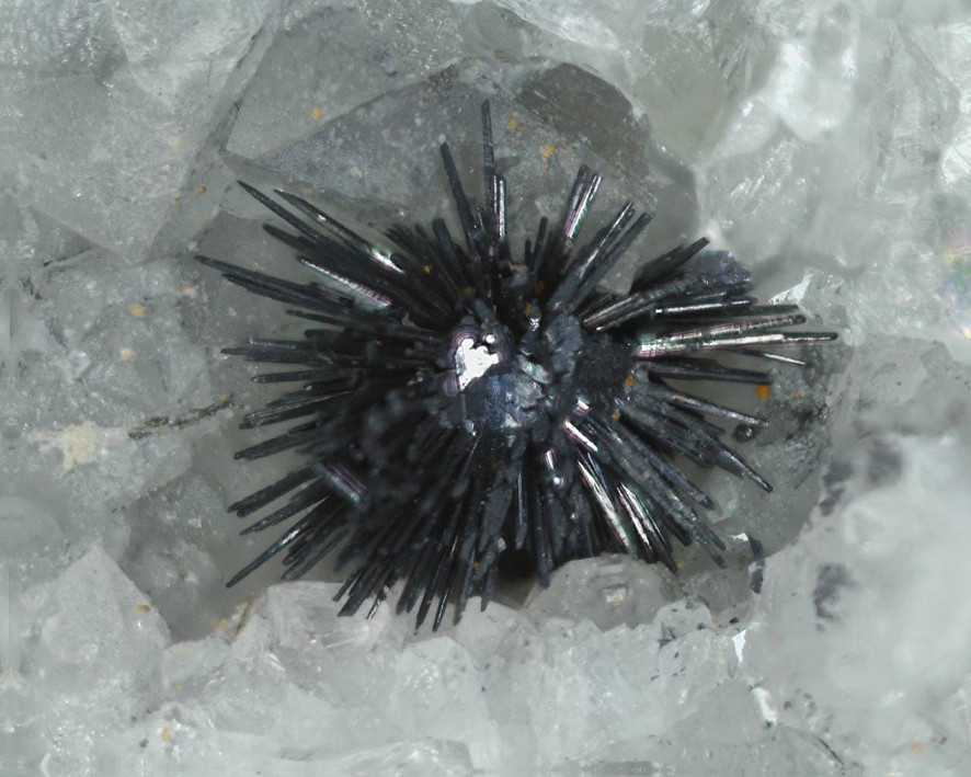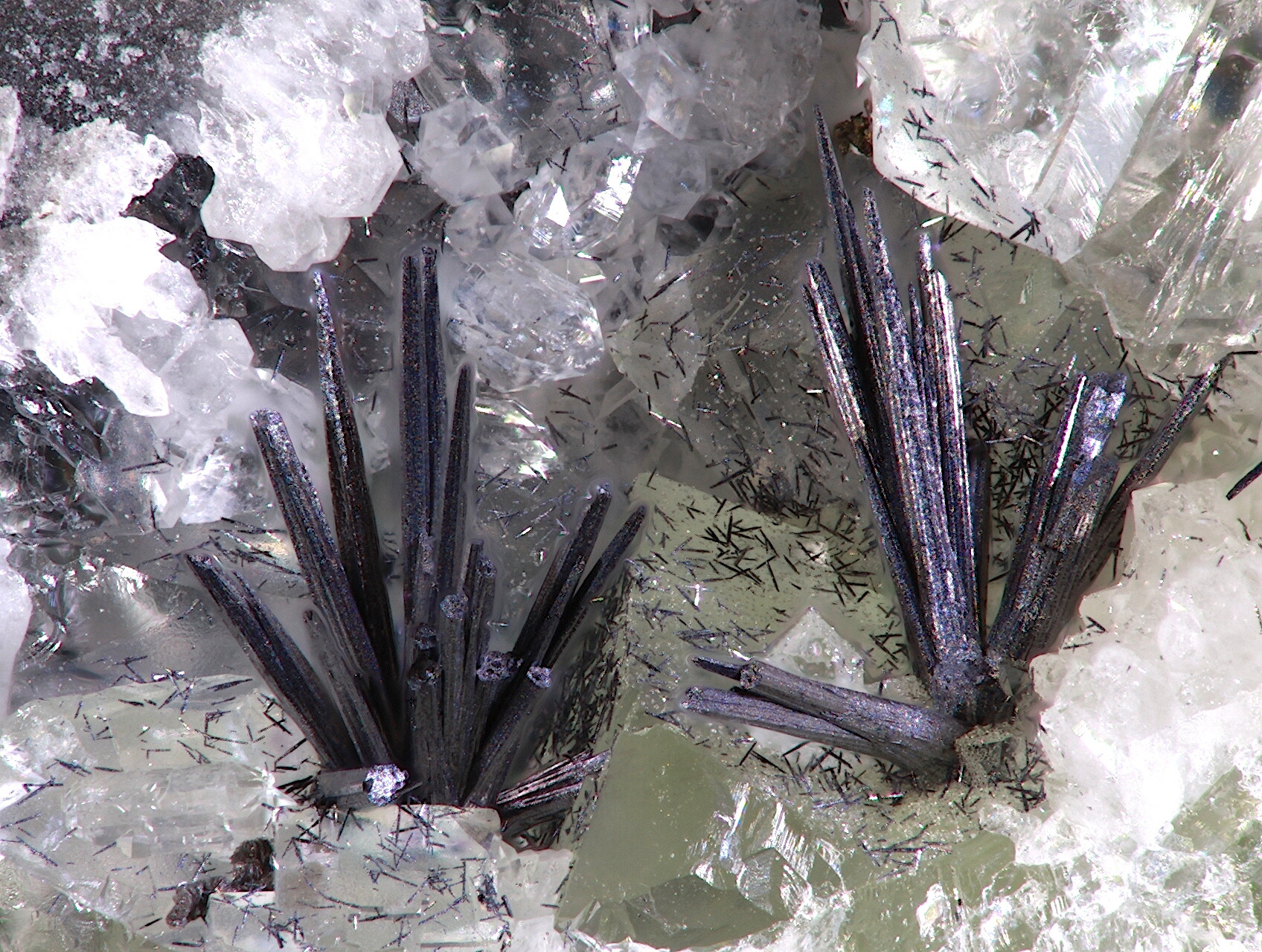 Die Hohlformen im Inneren vieler der grauen spießigen xx aus Bild 1 lassen mich schon an eine Pseudomorphose denken. Weiß man denn etwas über die im Fluorit eingeschlossenen nadeligen xx mit Metallglanz aus Bild 1? Vlt lässt sich hieraus ein geochemischer Zusammenhang herstellen.