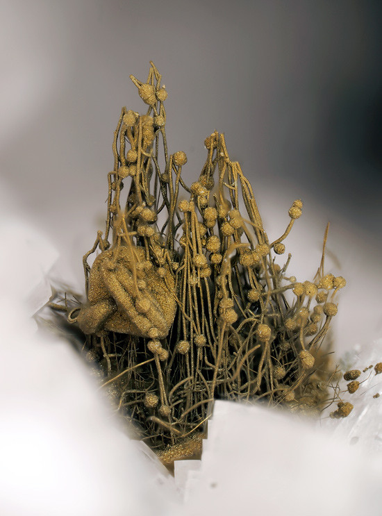 Wir hatten in der letzten Ausgabe der Mineralien-Welt einen kleinen Bericht über den Fundort "Schretzmair" mit vielen Bildern von Matthias Reinhardt - unter anderem auch von äußerst bizarren Pyriten. Das, was man auf dem Bild so schön goldgelb metallisch sieht, ist mit Sicherheit Pyrit. Zumindest oberflächlich. Ob zum Beispiel die fadenartigen Gebilde zuvor oder im Kern mal etwas anderes waren oder sind - keine Ahnung. Dürfte auch zu klein und zu fein sein, um es mittels Analyse eindeutig rauszufinden.