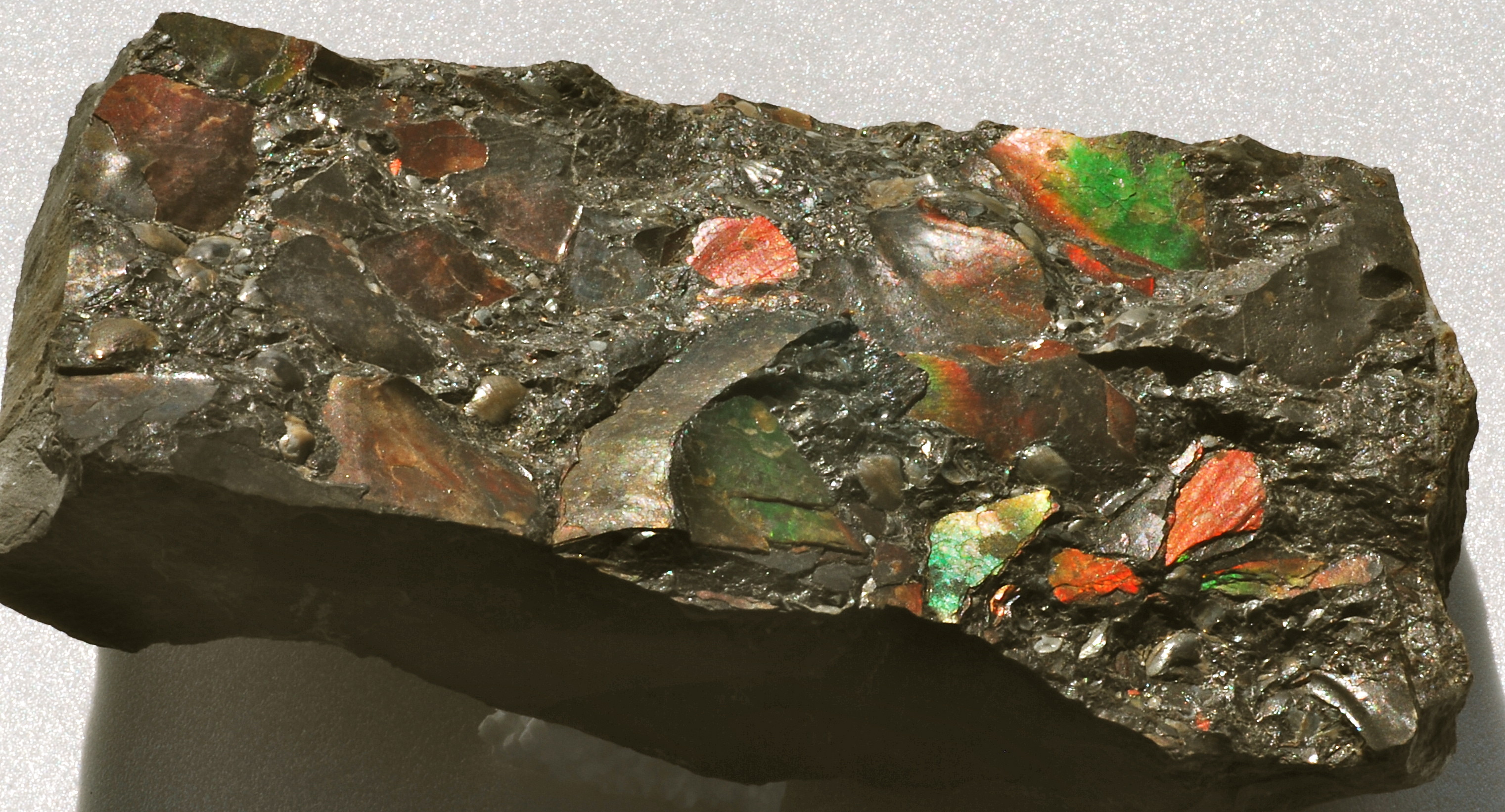 Dein Bild zeigt ein sedimentäres Gestein (Kalk oder Marmor) mit irisierenden Muschelschalen.