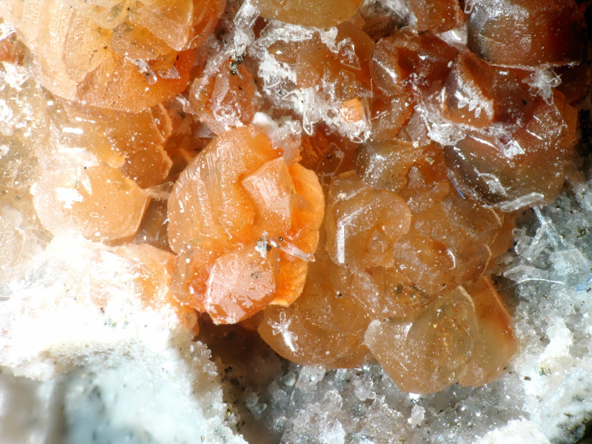 Nicht die orangfarbenen Kristalle sind die Baryte, sondern die weißlichen/farblosen Kristalle im rechten Bildbereich. Bei den orangenen XX handelt es sich um Calcit.