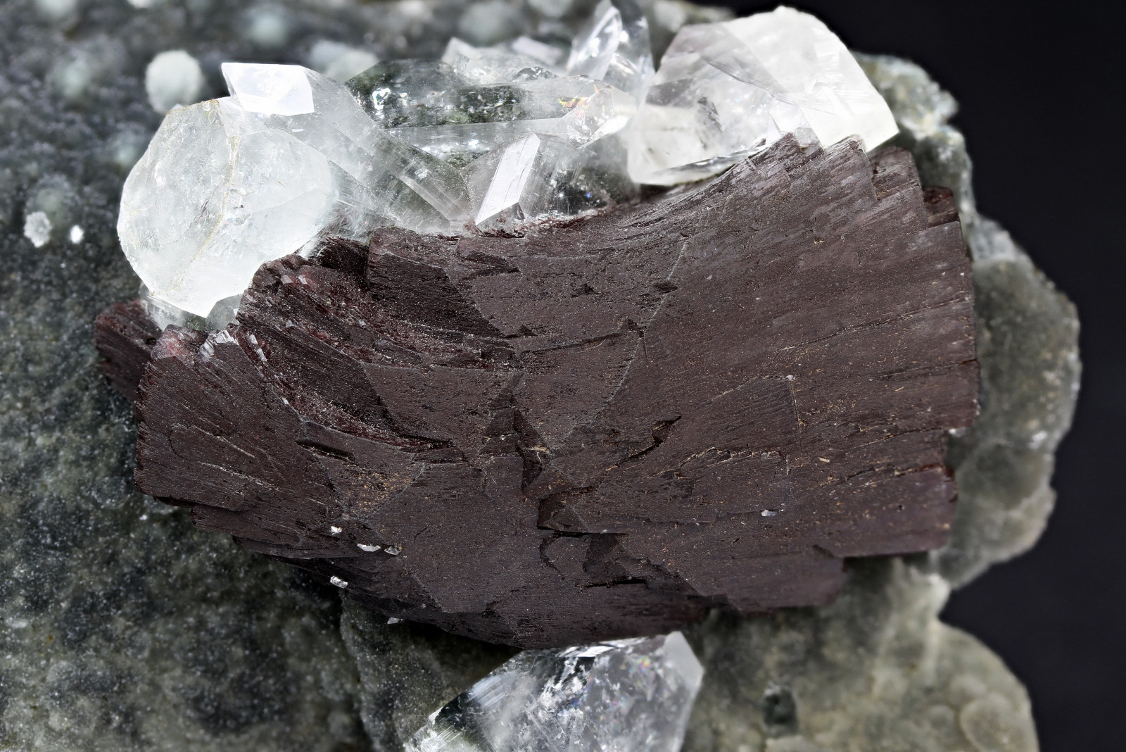 Das helle Kristallaggregat sieht sehr nach Heulandit aus.