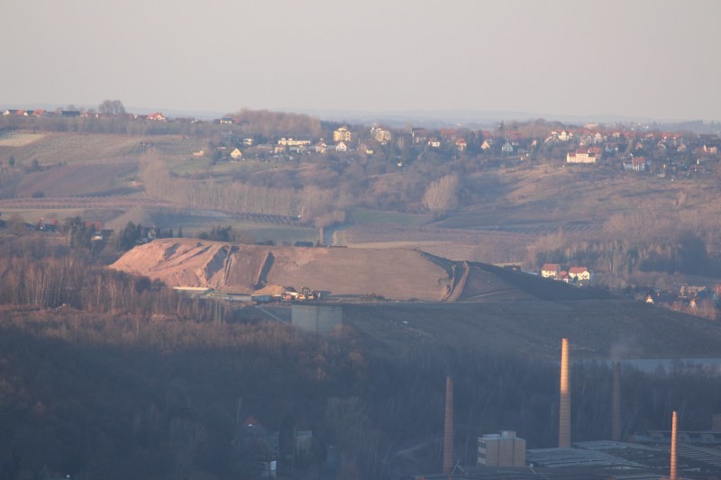 Blick über den älteren Teil der Halde Ri. nordöstlich nach Freital, rechts der Hausberg der Stadt, der Windberg