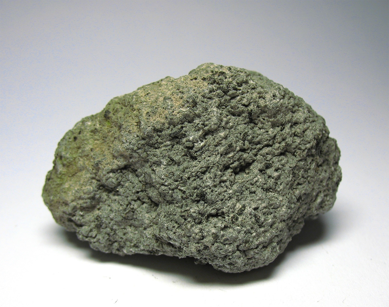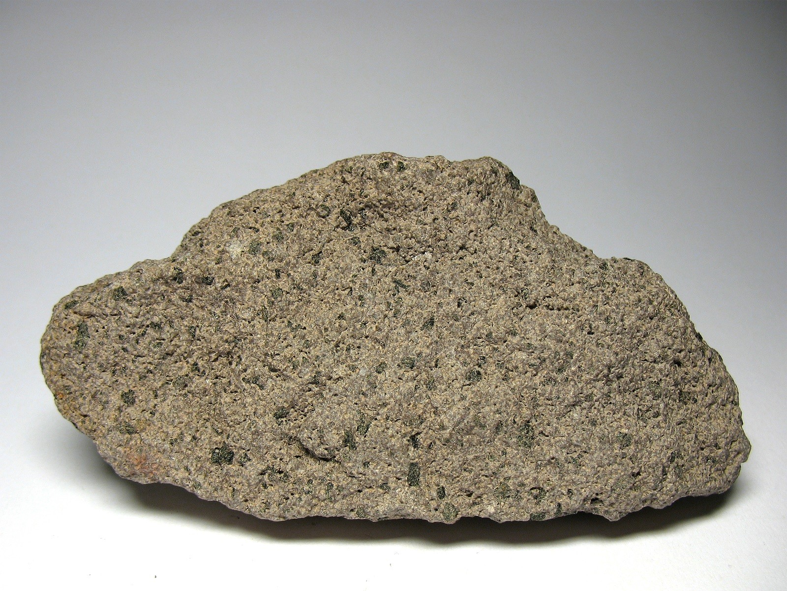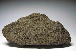 Erstes Stück ist von grauer Farbe, 70x45x30 mm groß und beinhaltet schwarzgrünliche, glasglänzende Einschlüsse. Der gezeigte Einschluss misst 2 mm.
