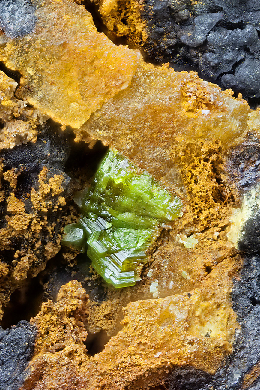 Sphalerit ist kubisch (oft tetraedrisch), im Bild aber sind deutlich hexagonale Winkel zu sehen. Ich tippe auch auf Pyromorphit in Limonit.