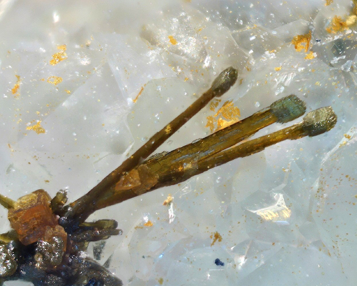 und Nr.3 winzige Olivenite auf Mansfieldit von Cap Garonne/Frankreich, BB ~2,5mm