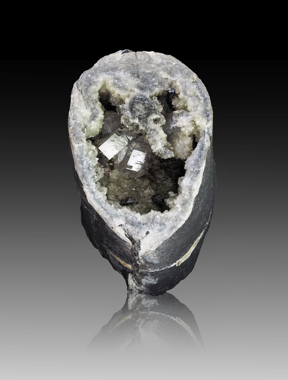 -- Die Doggerammoniten der Grube Porta an der Porta Westfalica zeigen in den Kammern ein reiches und buntes mineralogisches Innenleben mit Calcit, Siderit, Aragonit, Ankerit, Coelestin, Gips, Pyrit und gelegentlich auch Sphalerit und andere Sulfide. Bilder sollte sich finden lassen