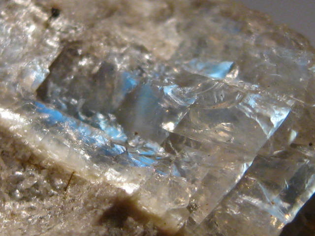 Der bläulich-weiße flächenhafte Schimmer erinnert mich eher an Mondstein bzw. an die Albit-Varietät Peristerit.