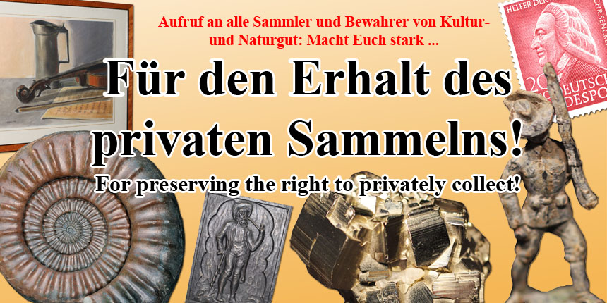 Bitte nehmt Euch eine Minute Zeit und unterzeichnet die Petition "Für den Erhalt des privaten Sammelns".Für den Erhalt des privaten Sammelns // For preserving the right to privately collectJede Stimme zählt und erhöht den Druck auf die Politik! Wir hoffen auf die internationale Solidarität aller Sammlerinnen und Sammler von Natur- und Kulturgut sowie aller Wissenschaftler, die mit diesen Gütern arbeiten.