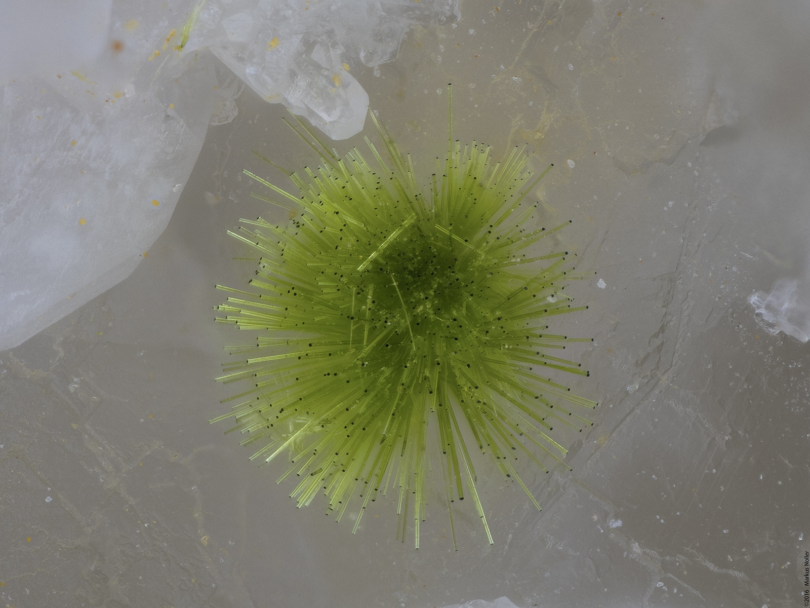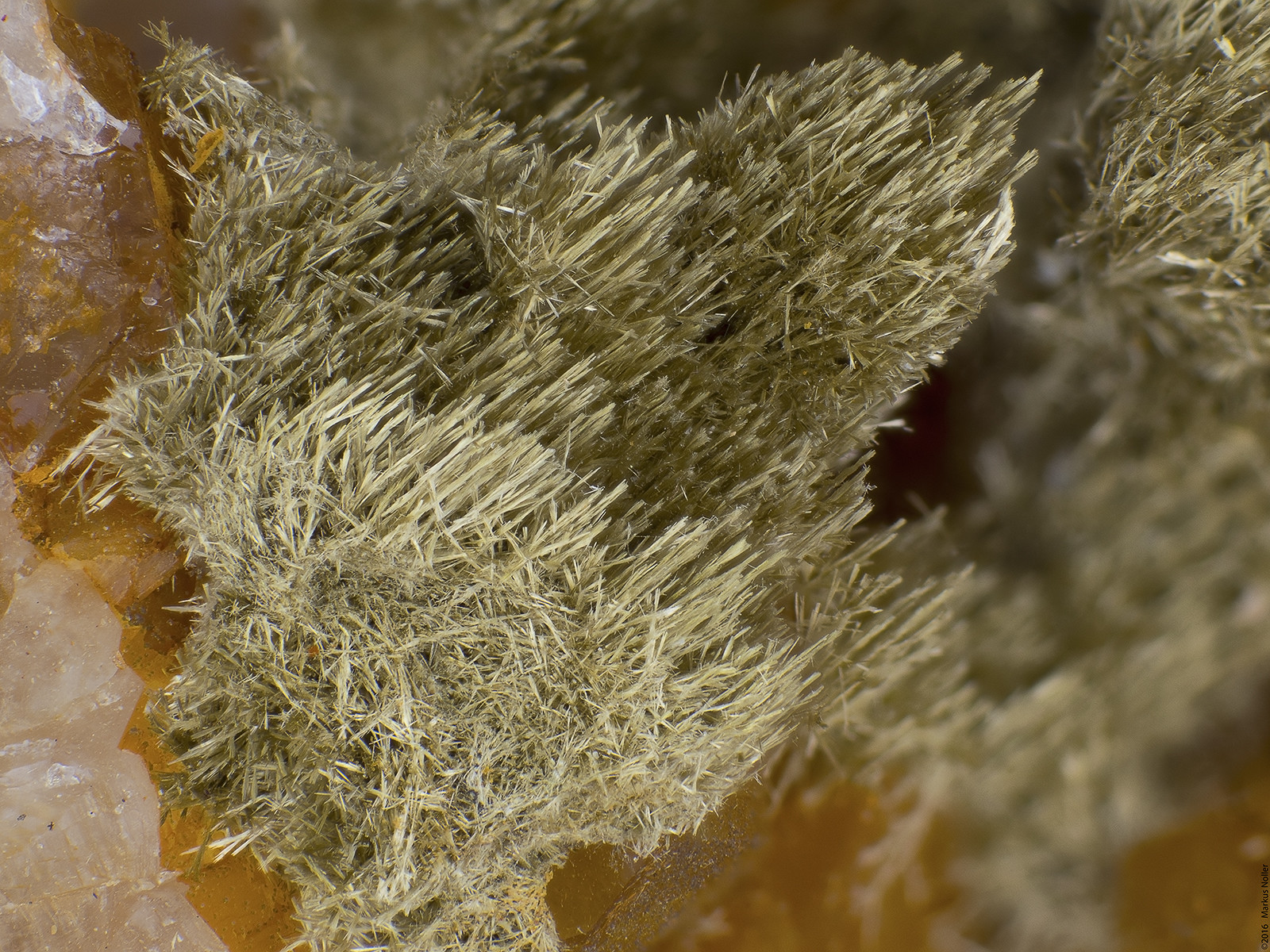 Duftit xx auf Quarz xx. Die Bildbreite beträgt ca. 1,6mm mit dem 10er Mitu:
