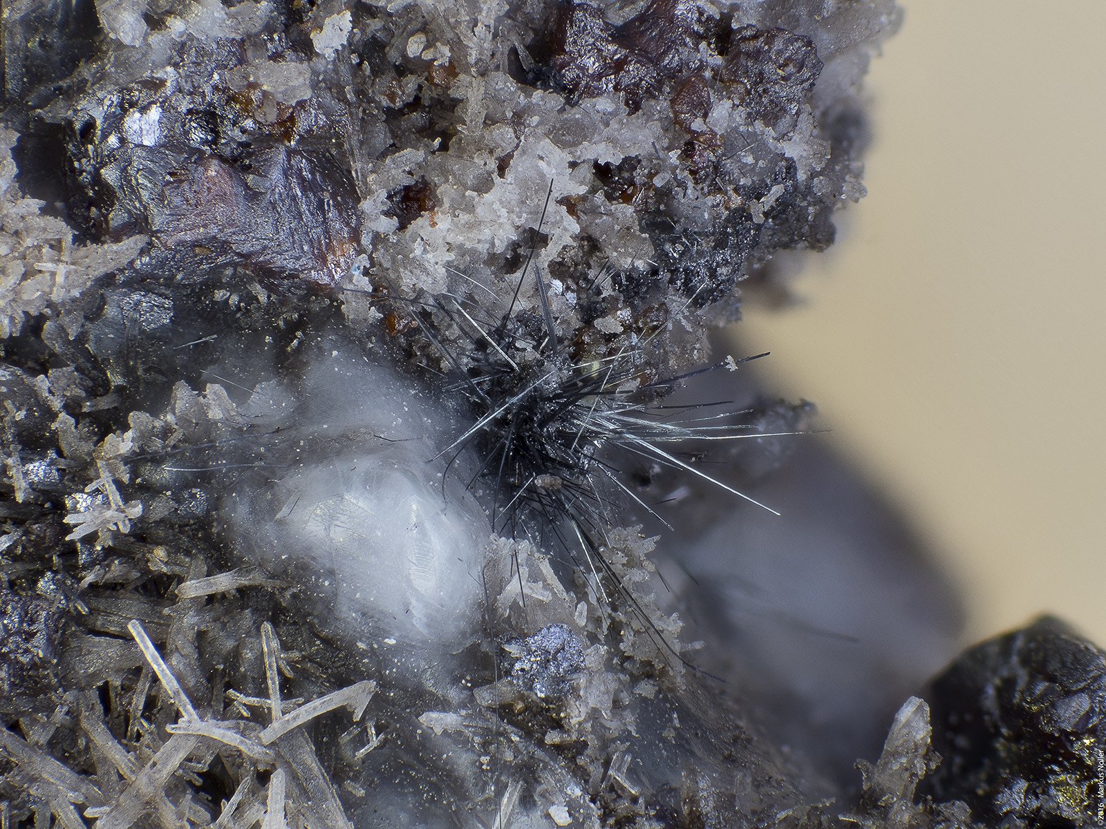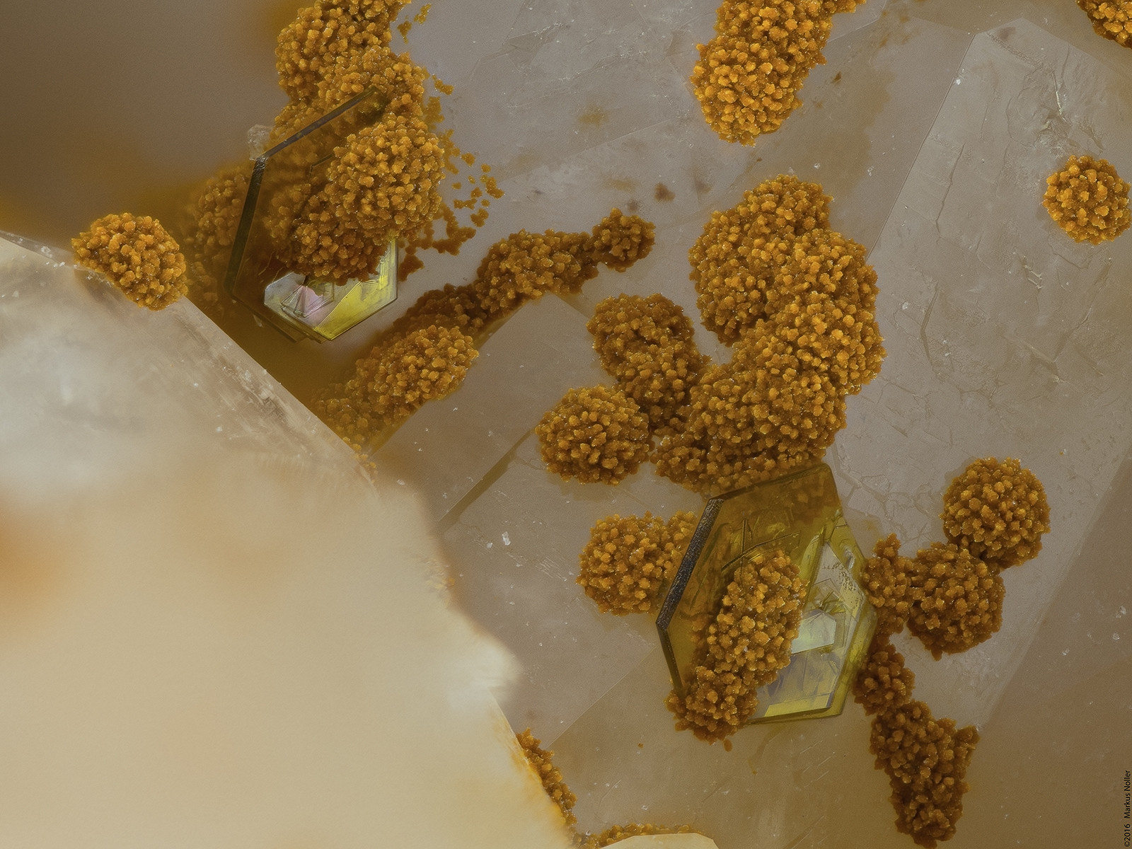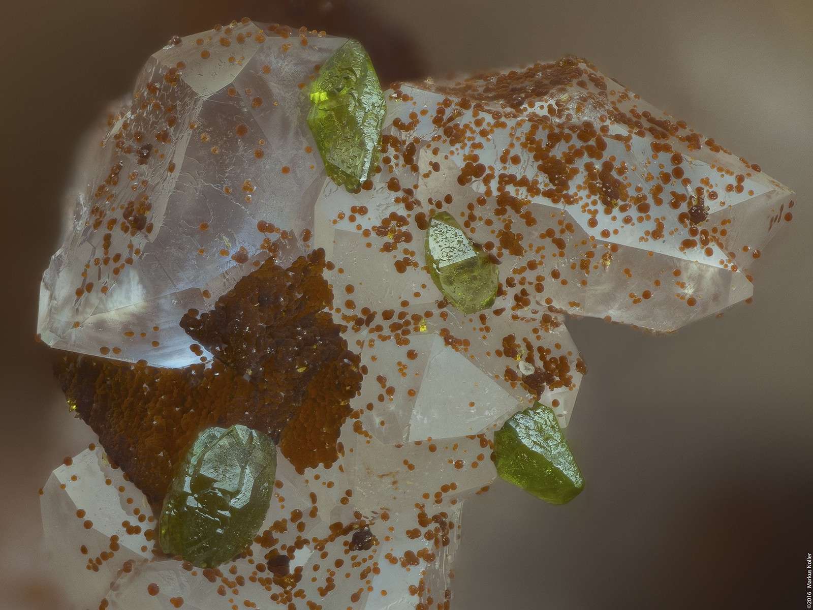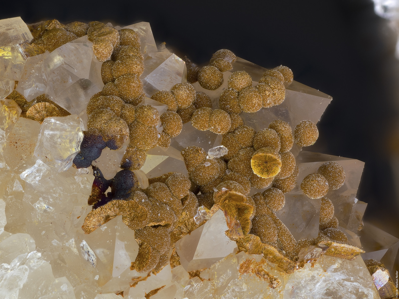 Und hier noch braune Kugeln auf Quarz, von denen ich keine Ahnung habe, was das ist. Kann jemand helfen? Die Bildbreite beträgt auch hier ca. 3,2mm mit dem 5er Mitu: