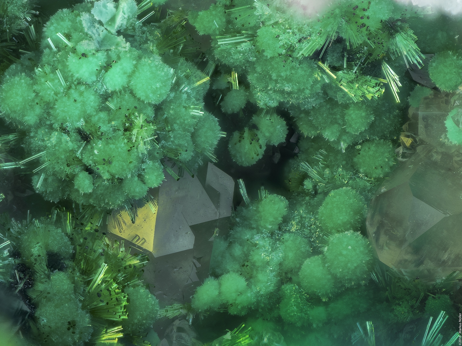 Beudantit xx mit braunen Kugeln. Auch hier habe ich keine Ahnung, was das für braune Kugeln sind... Die Bildbreite beträgt ca. 1,6mm mit dem 10er Mitu: