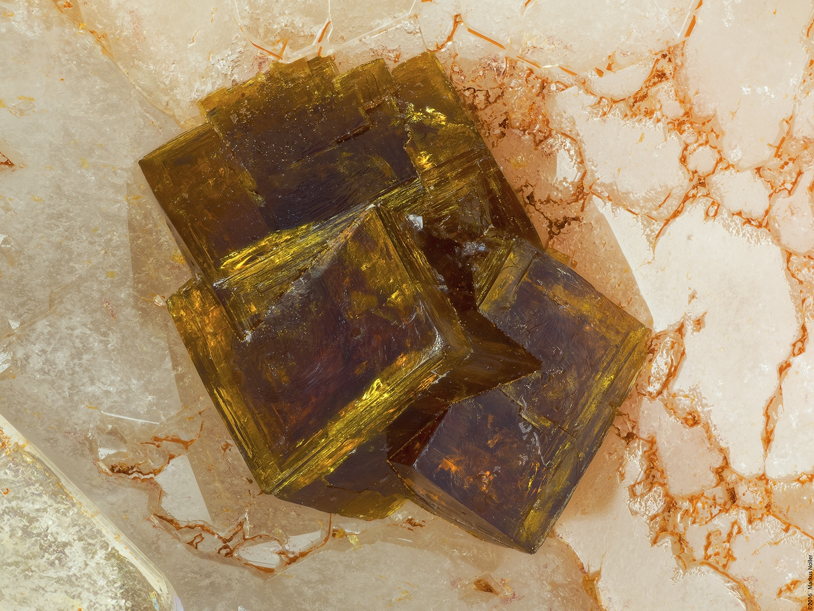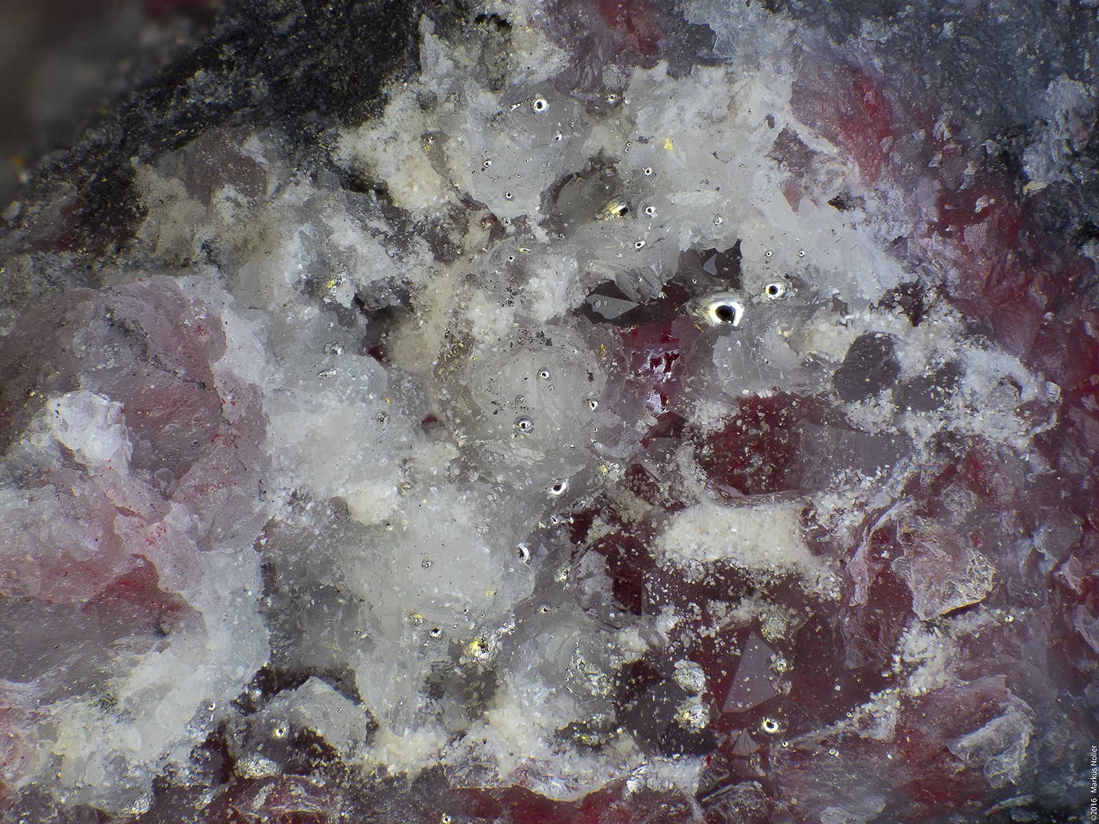 Und hier noch einen Verhau an violettem Fluorit xx mit aufgewachsenem Magnesit xx. Dabei wird ein Fluorit X von einem Magnesit X durchdrungen. Die Bildbreite beträgt ca. 3,2mm mit dem 5er Mitu: