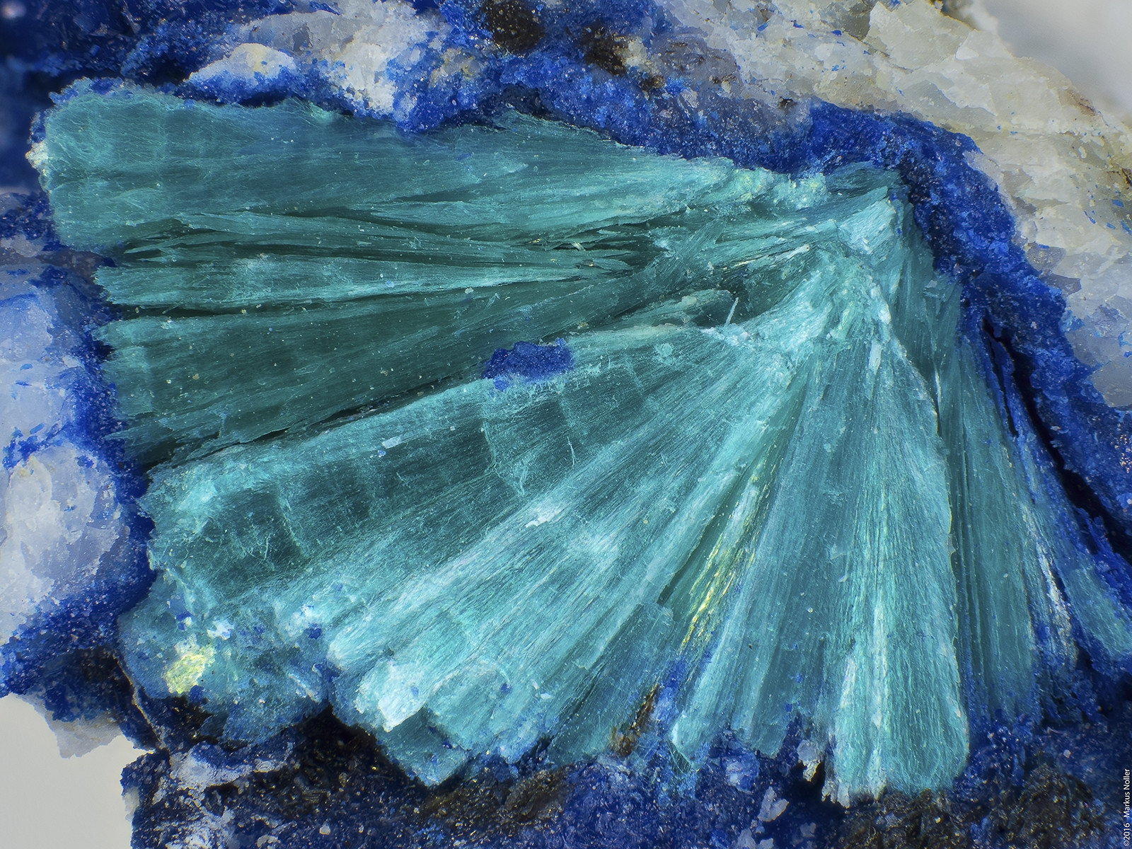 Tirolit xx auf Azurit aus Rotholz/Tirol. Die Bildbreite beträgt ca. 8mm mit dem 2er Mitu: