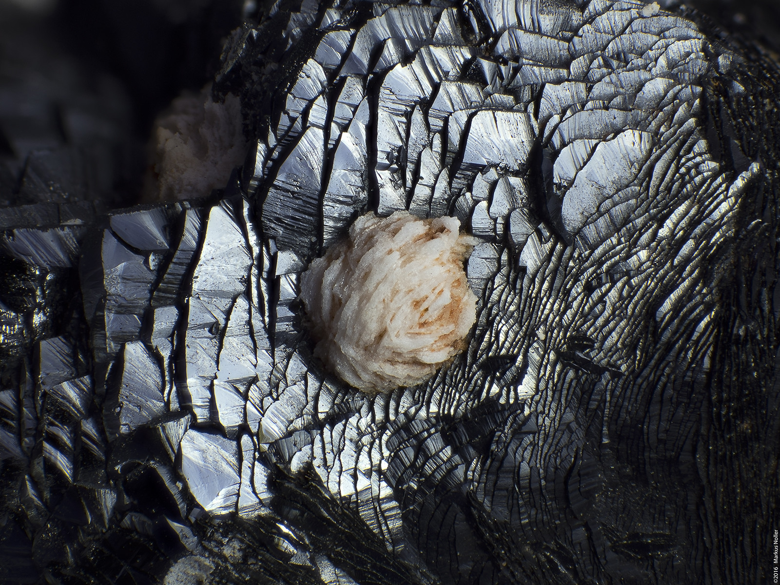 Groutit xx mit einem kleinen Baryt-Röschen aus der Grube Emilie/Bülten-Adenstedt. Die Bildbreite beträgt ca. 8mm mit dem 2er Mitu: