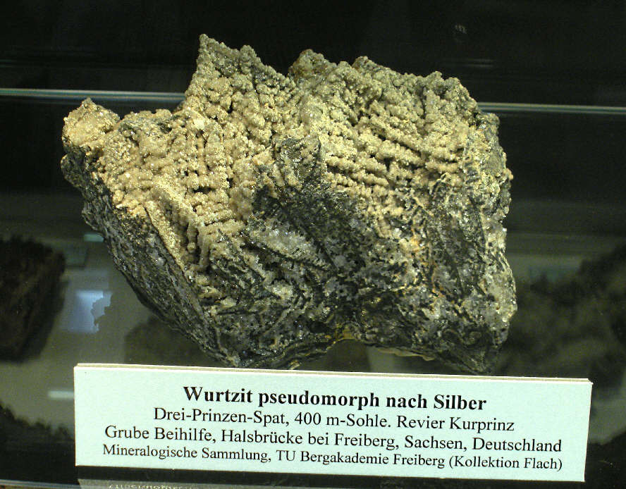 das zum Stück gehörige Schild macht mich etwas stutzig, auch wenn es ein Schild der BAF ist. Das dendtitisch-federförmig auftretende Mineral ist zweifellos Wurzit, ich glaube aber nicht das es eine Pseudomorphose nach Silber ist. Es gibt ein ganze Reihe von Mineralen die dendritisch-federförmig auftreten können, gerade bei den Sulfiden. Ich habe eine gleichartige Stufe vom selben Fundpunkt (siehe folgende Bilder). Bei meinem Stück sieht man eindeutig, dass die federartigen Wurzitdendriten direkt aus einer Wurzitschicht der darunterliegenden Schalenblende herauswachsen. Die Fundstelle lag im Drei Prinzen Spat, also einem fba-Gang, da ist ged. Silber eher unwarscheinlich.