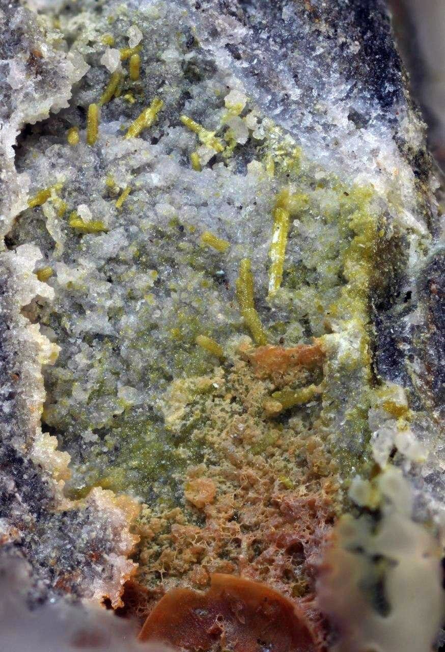 Bindheimit von der Glücksradhalde war eher blass - fast crèmefarben bis gelb, Beudantit/Segnitit gelb-braun bis grün auch giftgrün. Häufig hatte ich Mimetesitnadeln assoziiert mit dem Beudantit/Segnitit, nicht aber mit Bindheimit. Außer bei den intensiv gelben Bindheimiten (Oxyplumboroméit) liessen sich auch bei starker Vergrößerung (und im REM) keine klaren Kristallite erkennen. Bei Segnitit/Beudantit waren immer mindestens Kristallflächen (z.B. als Reflexe) auch bei den belagartigen Formen erkennbar.