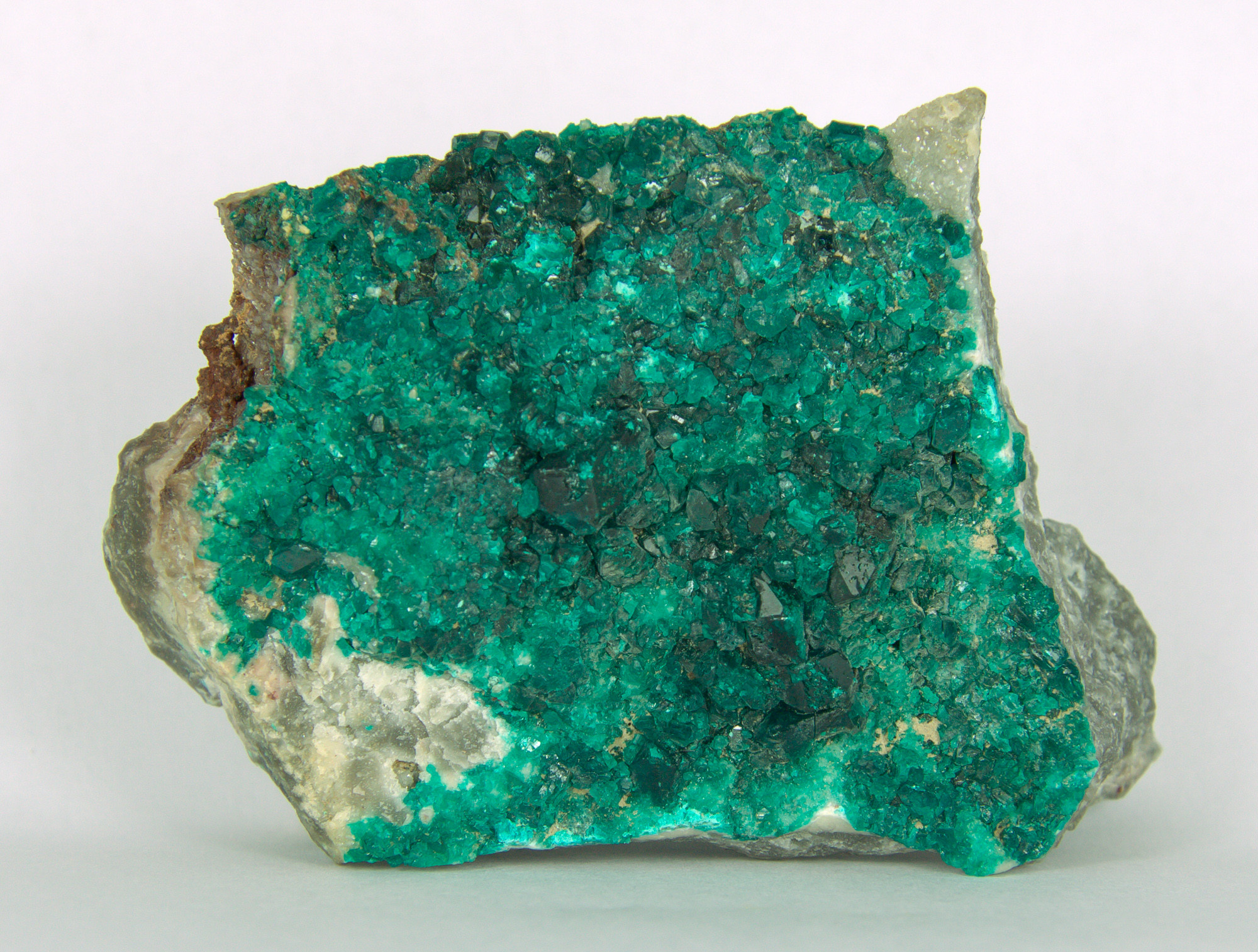 die auf der seitlichen Ansicht erkennbare Matrix der Dioptas-Stufe sieht sehr nach Altyn Tube, also Kasachstan aus.
