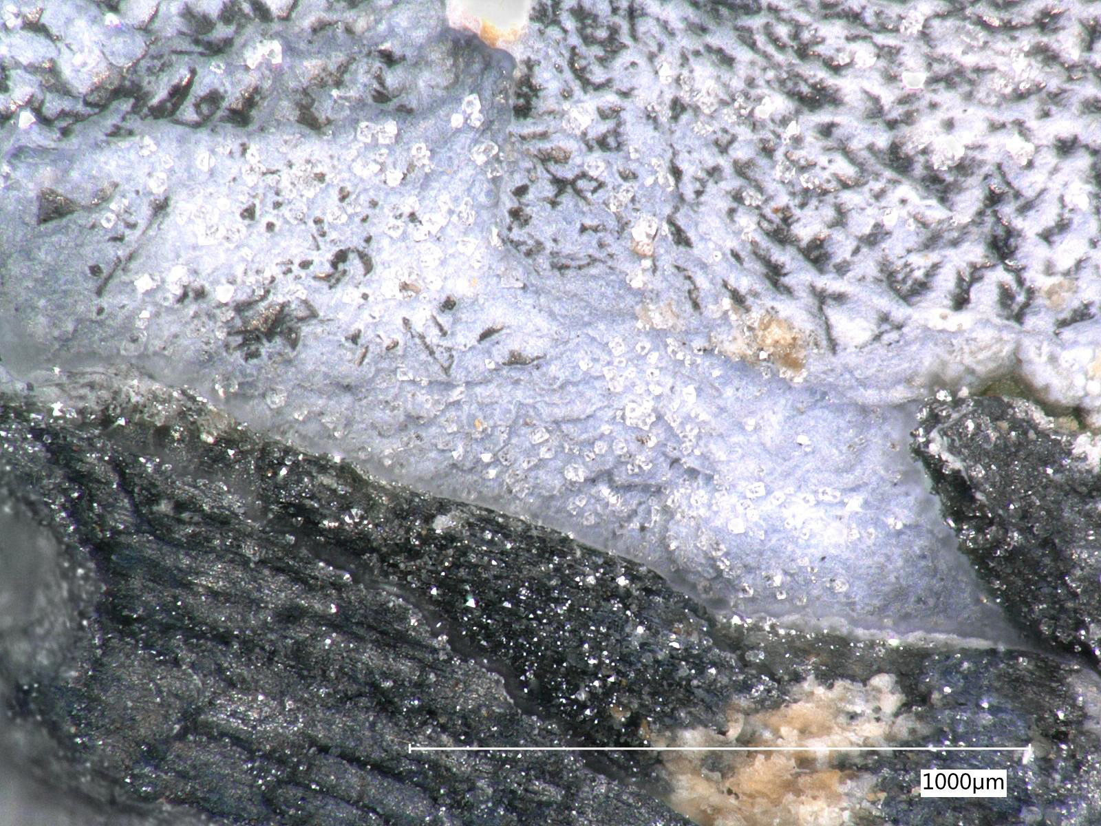 Hier wieder Arsenolith auf dem blauen Sekundärmineral und dem schwarzen Nickelin unten: