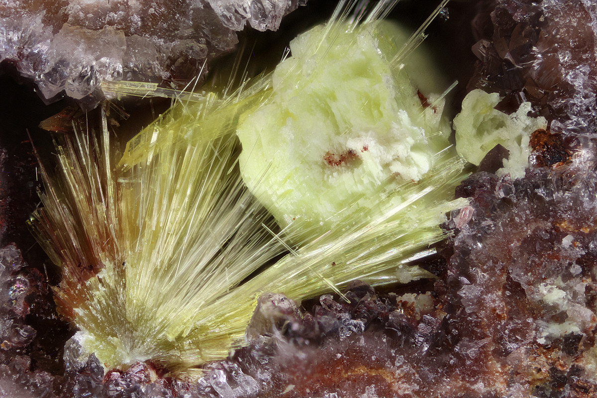 Uranophan xx auf Stinkspat aus der Grube Clara/Schwarzwald. Die Bildbreite beträgt ca. 3,2mm mit dem 5er Mitu: