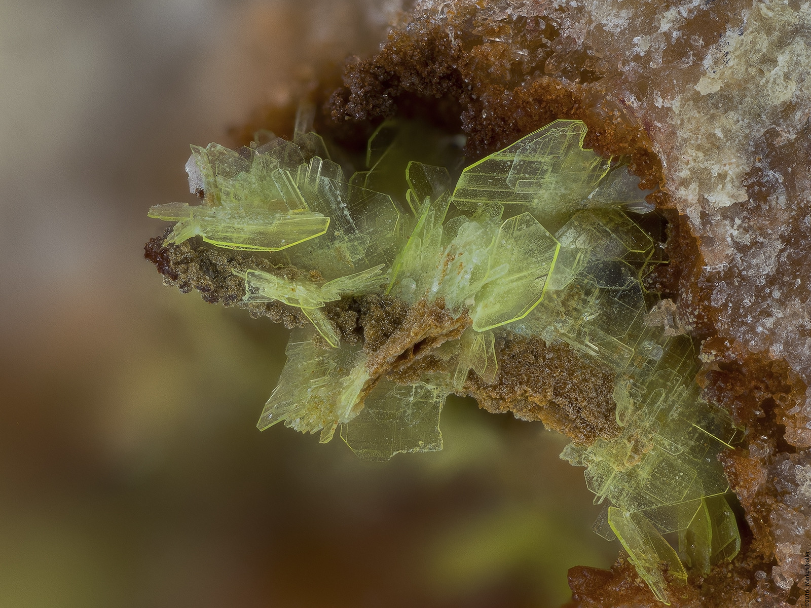 Torbernit xx mit Uranophan xx aus der Grube Brunhilde/Schwarzwald. Die Bildbreite beträgt ca. 3,2mm mit dem 5er Mitu: