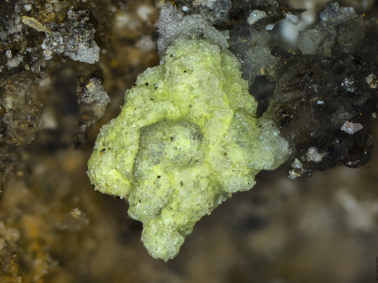 Schröckingerit xx aus Schacht St. Christoph/Bärenhecke/Sachsen. Ex H. Bültemann Sammlung. Die Bildbreite beträgt ca. 3,2mm mit dem 5er Mitu: