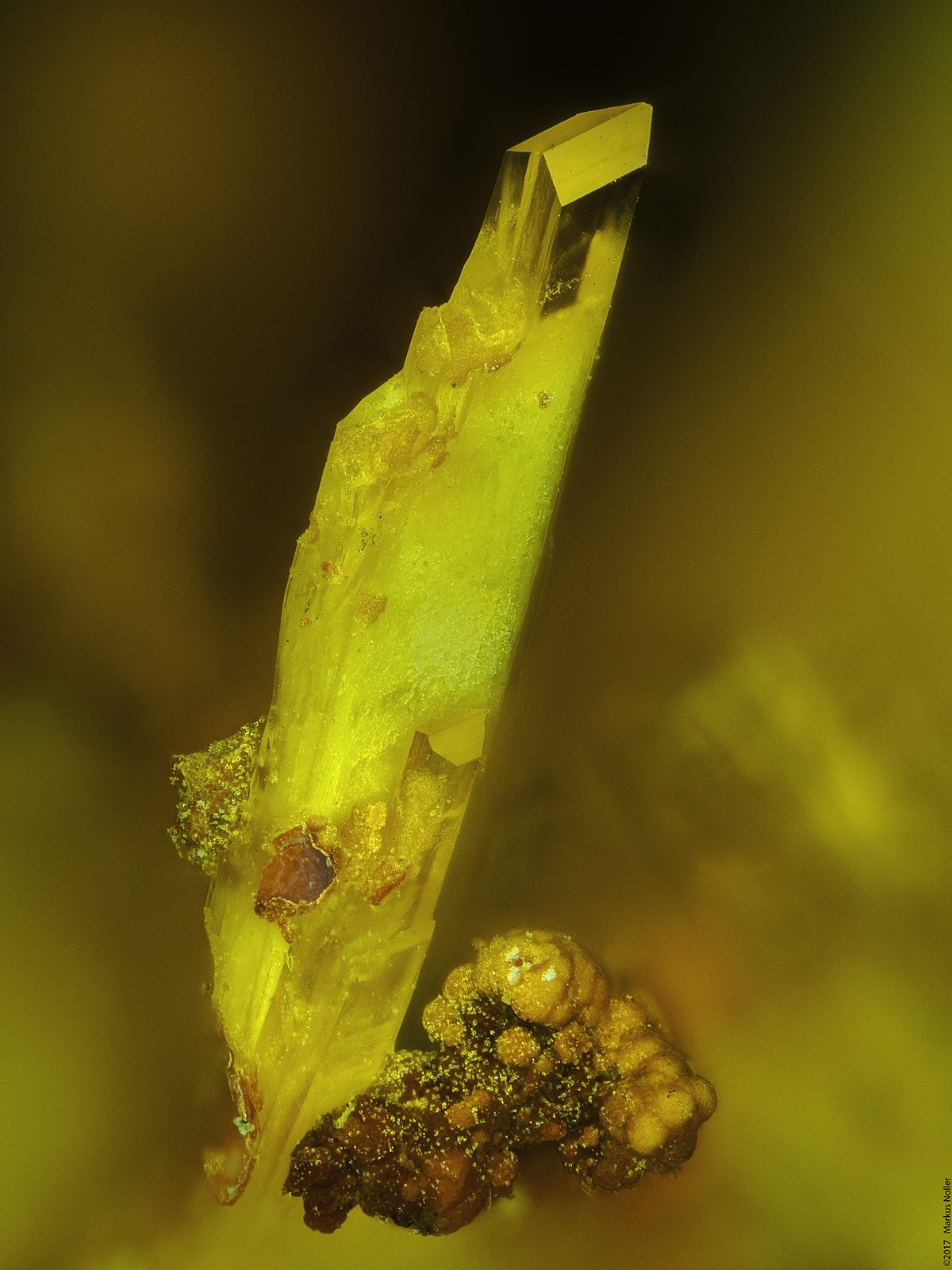 Richetit xx aus Shinkolobwe/Kongo. Ex Prof. Schoep Sammlung. Die Bildbreite beträgt ca. 3,2mm mit dem 5er Mitu: