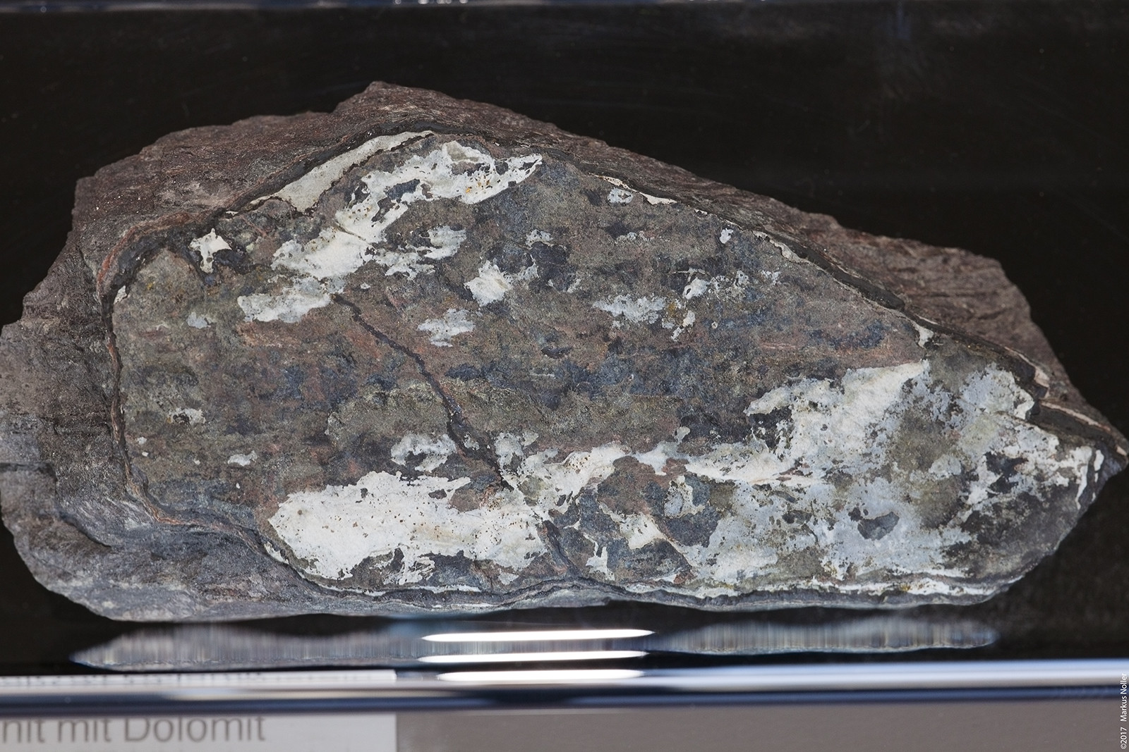 Gangstück Uraninit (Pechblende) mit Dolomit und Pyrit auf Schiefer vom Schacht 371/Hartenstein/Erzgebirge. Die Stufengröße beträgt ca. 22x10x10 cm3 (hier schon eingedost):