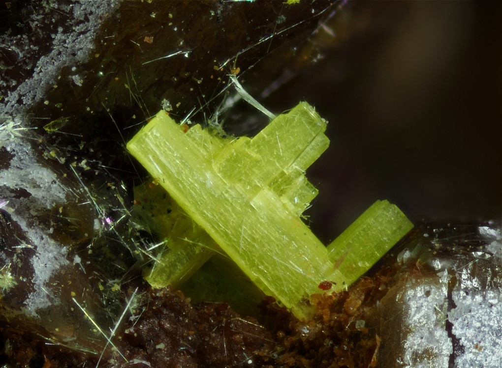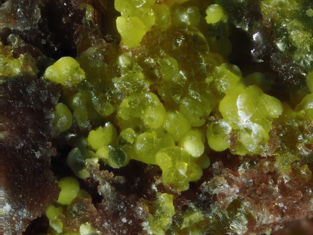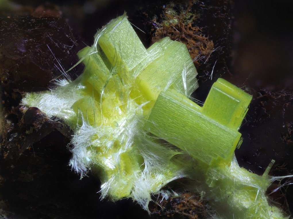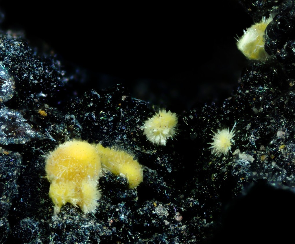 Sklodowskit xx auf Gips xx aus Lavrion/Griechenland. EDX/XRD analysiert. Die Bildbreite beträgt ca. 3,2mm mit dem 5er Mitu: