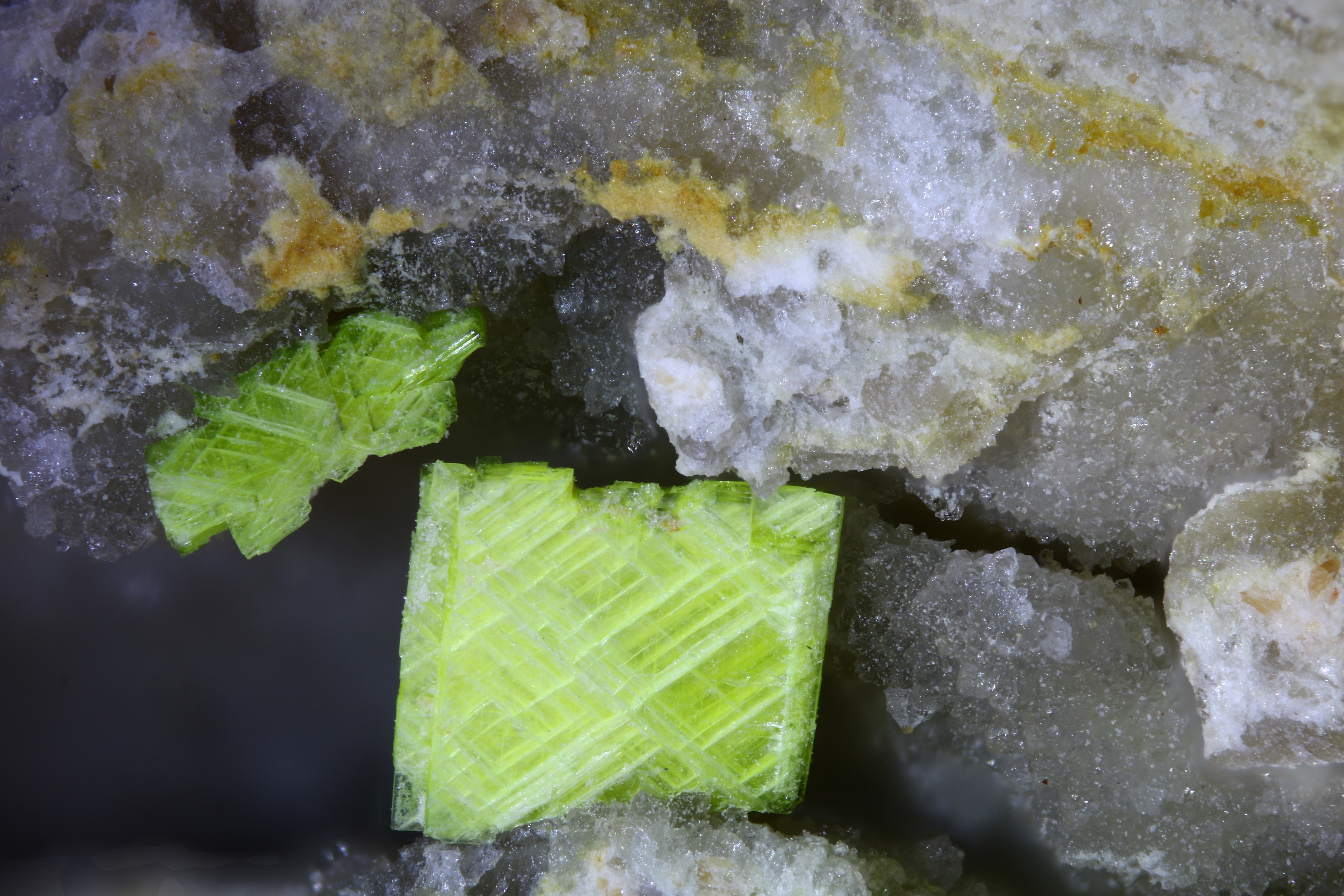 habe heute ein Uranophan und Uranocircit mit Uranophan auf einer Stufengröße von 1,5 x 1,5 cm und in Stacking ein paar Probebilder gemacht.
