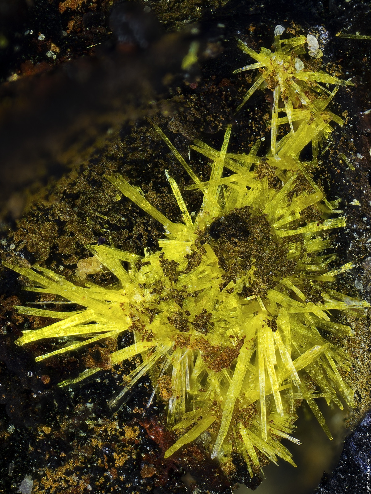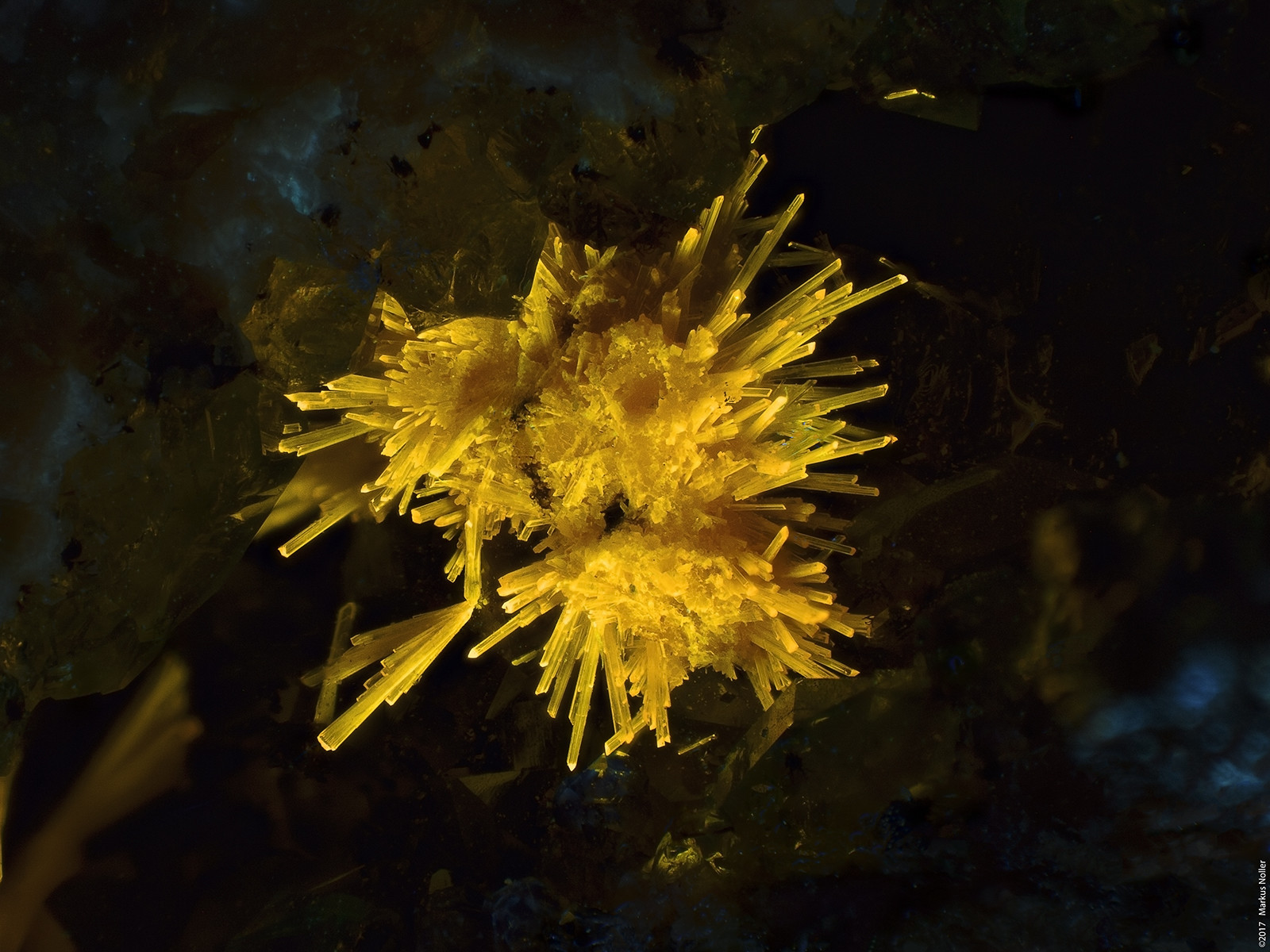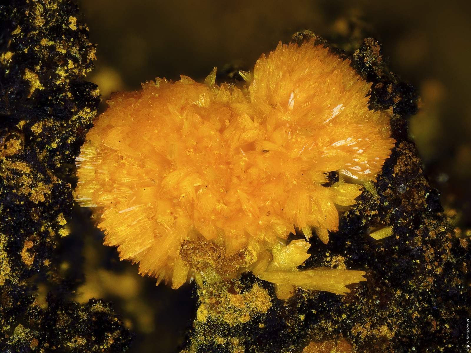 Dann habe ich gestern noch eine sehr interessante Entdeckung gemacht, als ich meine Cuprosklodowskitstufen aus Musonoi/Kongo mal wieder unter dem Mikroskop betrachtet habe. Das habe ich gefühlt schon hundert mal getan, aber irgend wie ist mir das immer entgangen. Auf einer Stufe sitzt gediegen Gold auf Cuprosklodowskit xx. Ich habe schon von Vergesellschaftung von Gold mit Pechblende, Torbernit und Vandenbrandeit gelesen/gesehen/gehört, aber auf Cuprosklodowskit xx ist mir bis dato nicht bekannt. Das hat mich dann doch etwas (freudig) überrascht...
