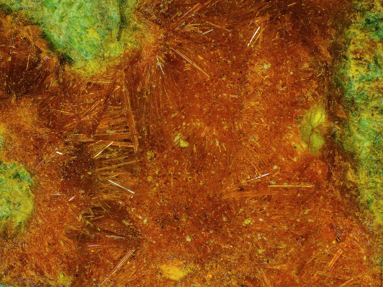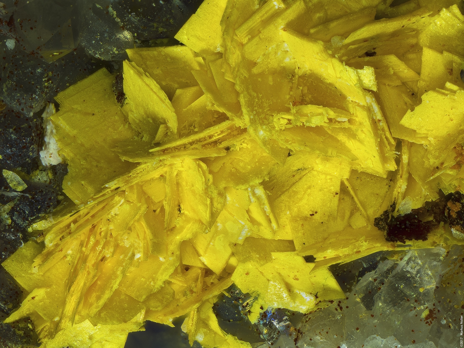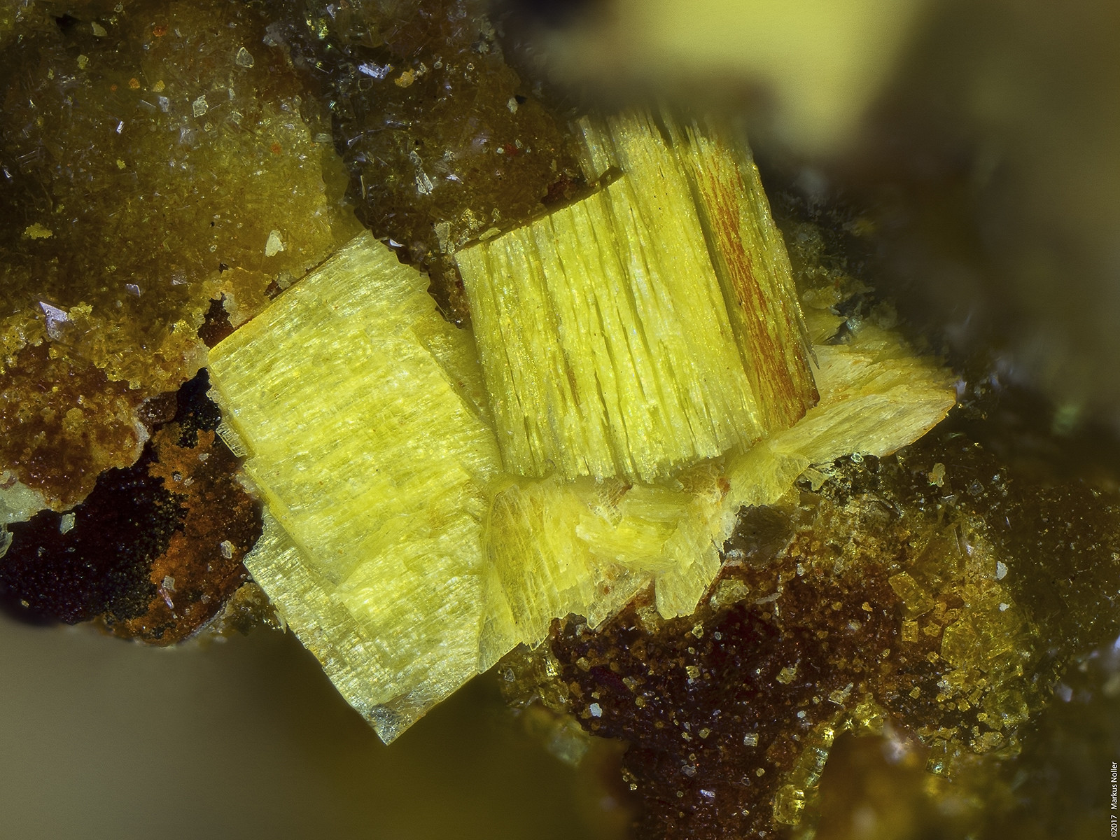 Wölsendorfit xx aus Shinkolobwe/Kongo. Ex Prof. Schoep Sammlung. Die Bildbreite beträgt ca. 1,6mm mit dem 10er Mitu: