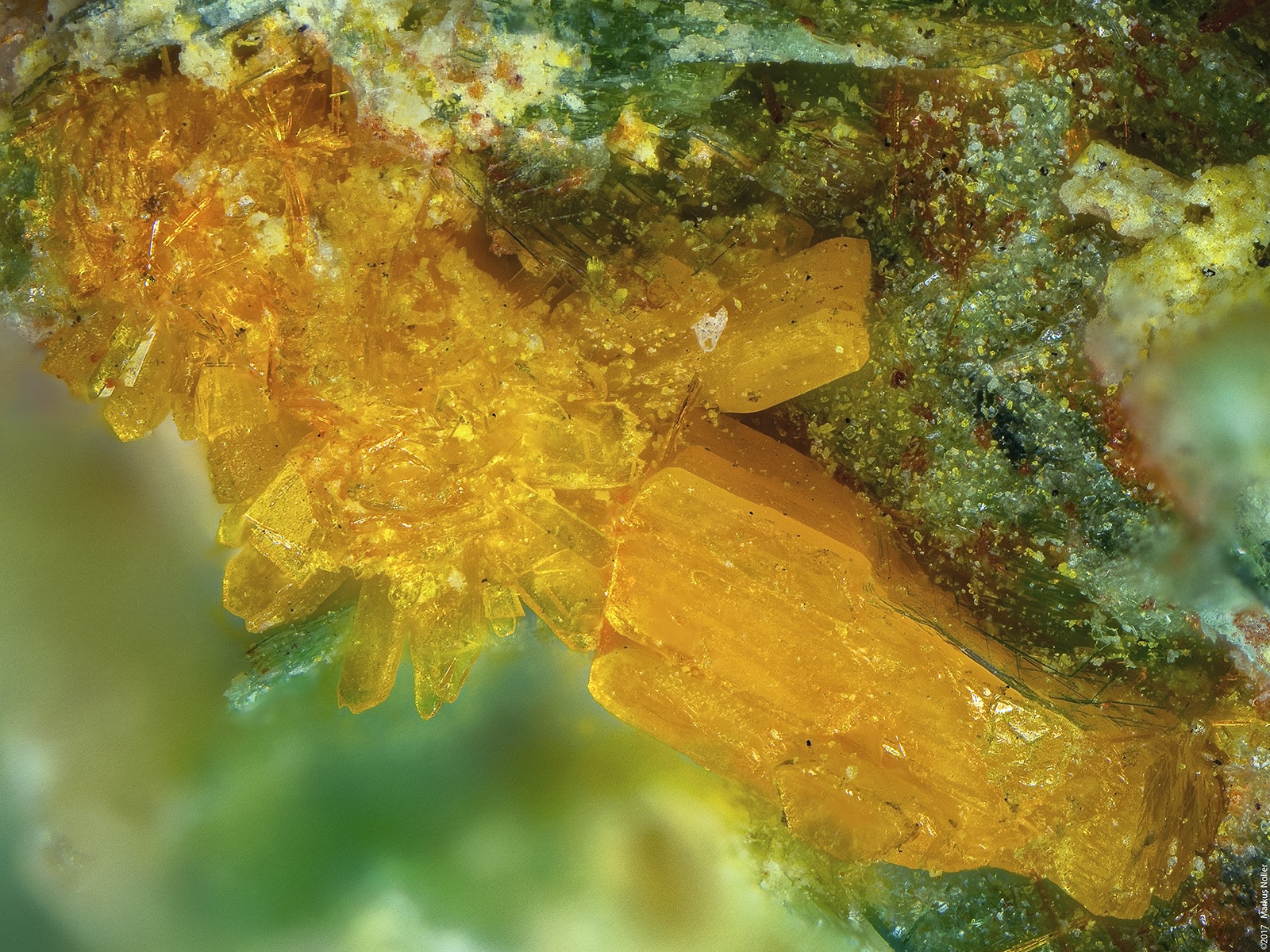 Masuyit xx mit Uranophan xx aus Shinkolobwe/Kongo. Ex Prof. Schoep Sammlung. Die Bildbreite beträgt ca. 3,2mm mit dem 5er Mitu: