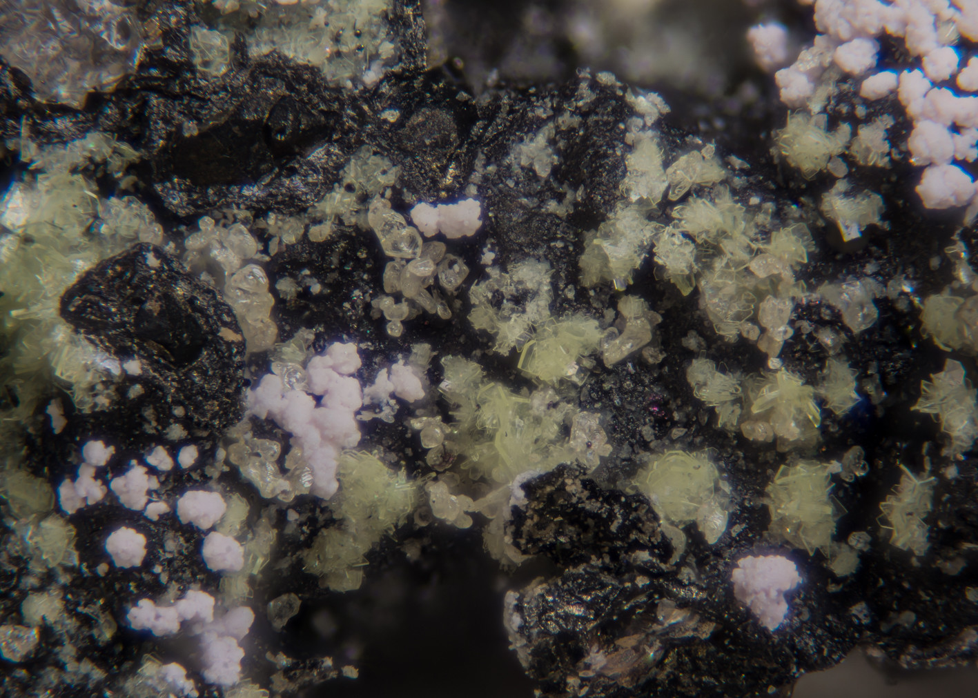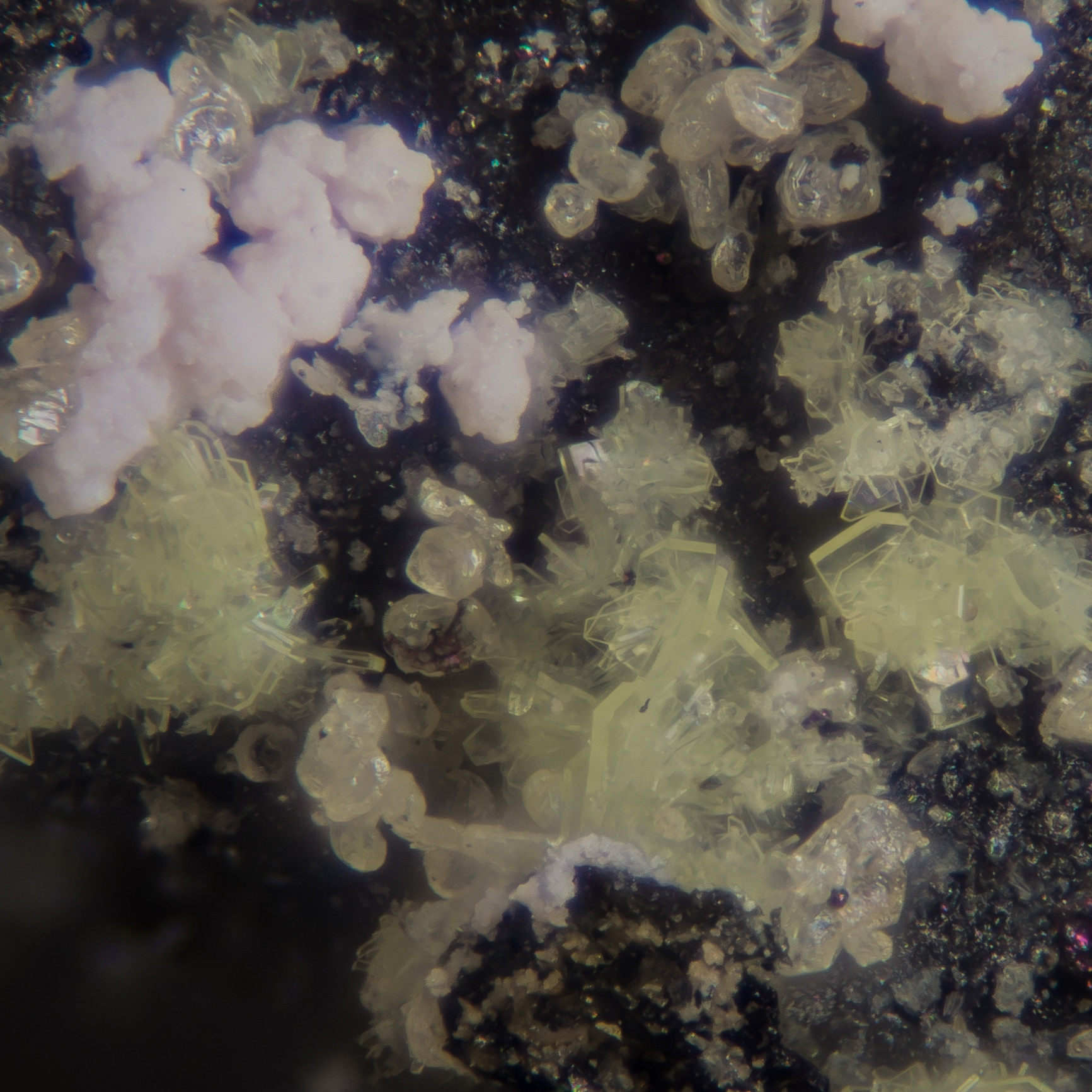 Metarauchit von der Halde #11 (Uran-Distrikt Horní Slavkov, CZ) hatte ich schon einmal als Detailbild vorgestellt. Die Paragenese ist durchaus auch interessant - Annabergit und Schwefel auf Arsenkies und Pechblende. Übersichtsbild mit 2.1mm, Details mit 0.7 mm bzw. 0.33 mm.