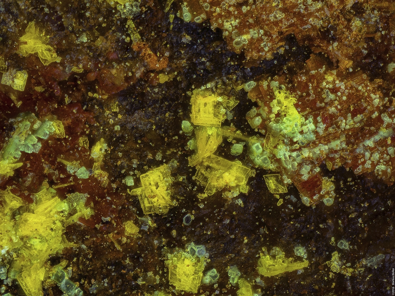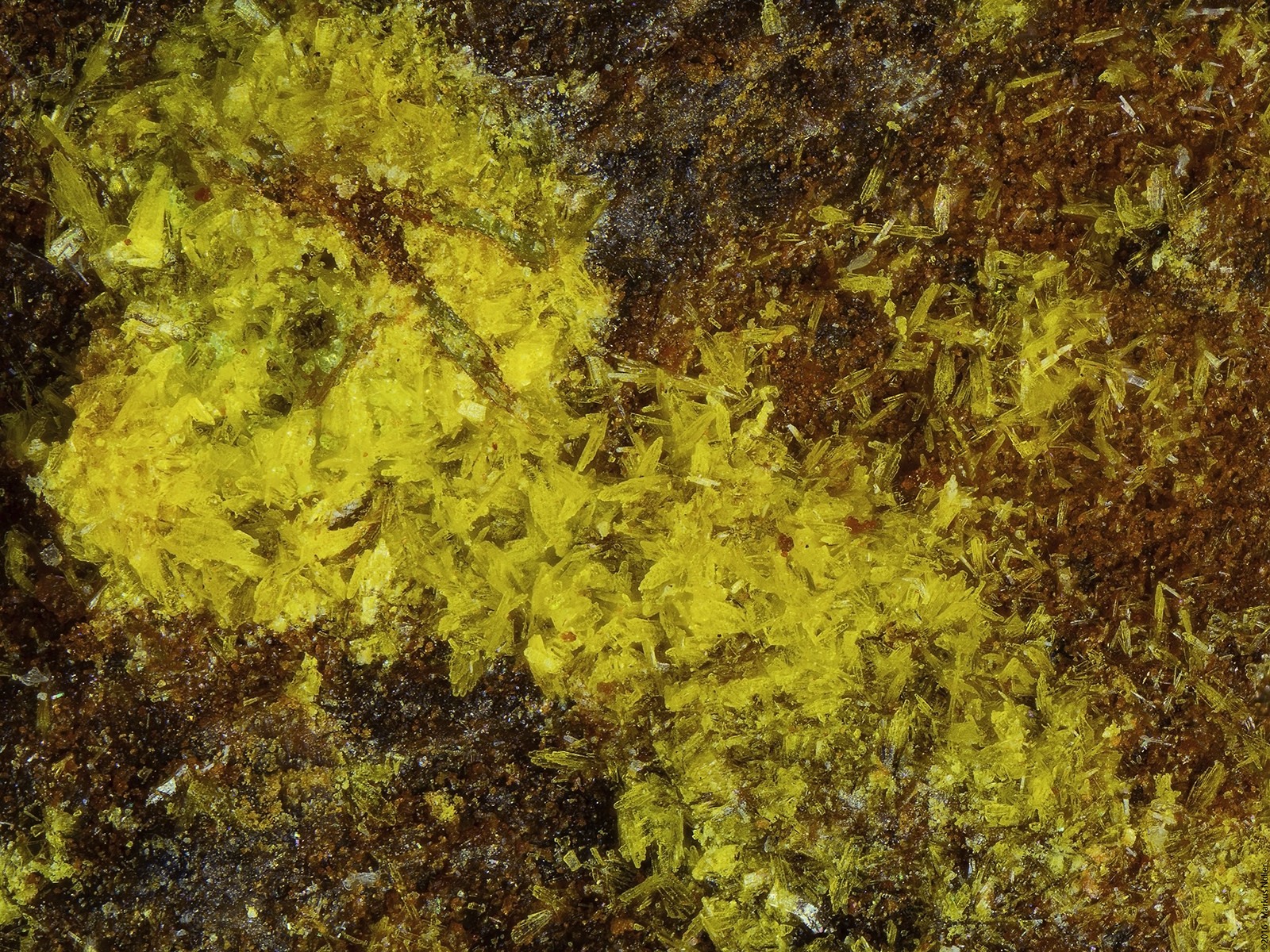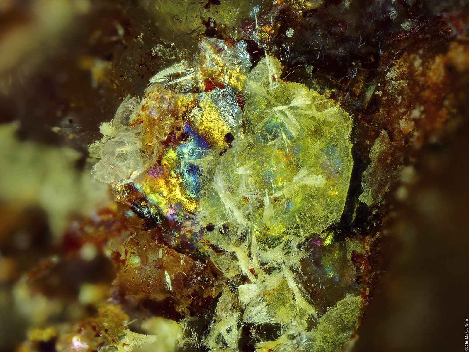 Autunit/Heinrichit xx Mischkristalle mit Uranophan xx von Streuberg/Bergen/Vogtland. Die Regenbogenfarben neben/unter dem Heinrichit kommen durch die Epibeleuchtung mit polarisiertem Licht und zeigt, dass das Material doppelbrechend ist (verm. Quarz). Die unterschiedlichen Farben repräsentieren in diesem Fall verschiedenen Schichtdicken und innere Spannungen. EDX analysiert. Die Bildbreite beträgt ca. 1,6mm mit dem 10er Mitu: