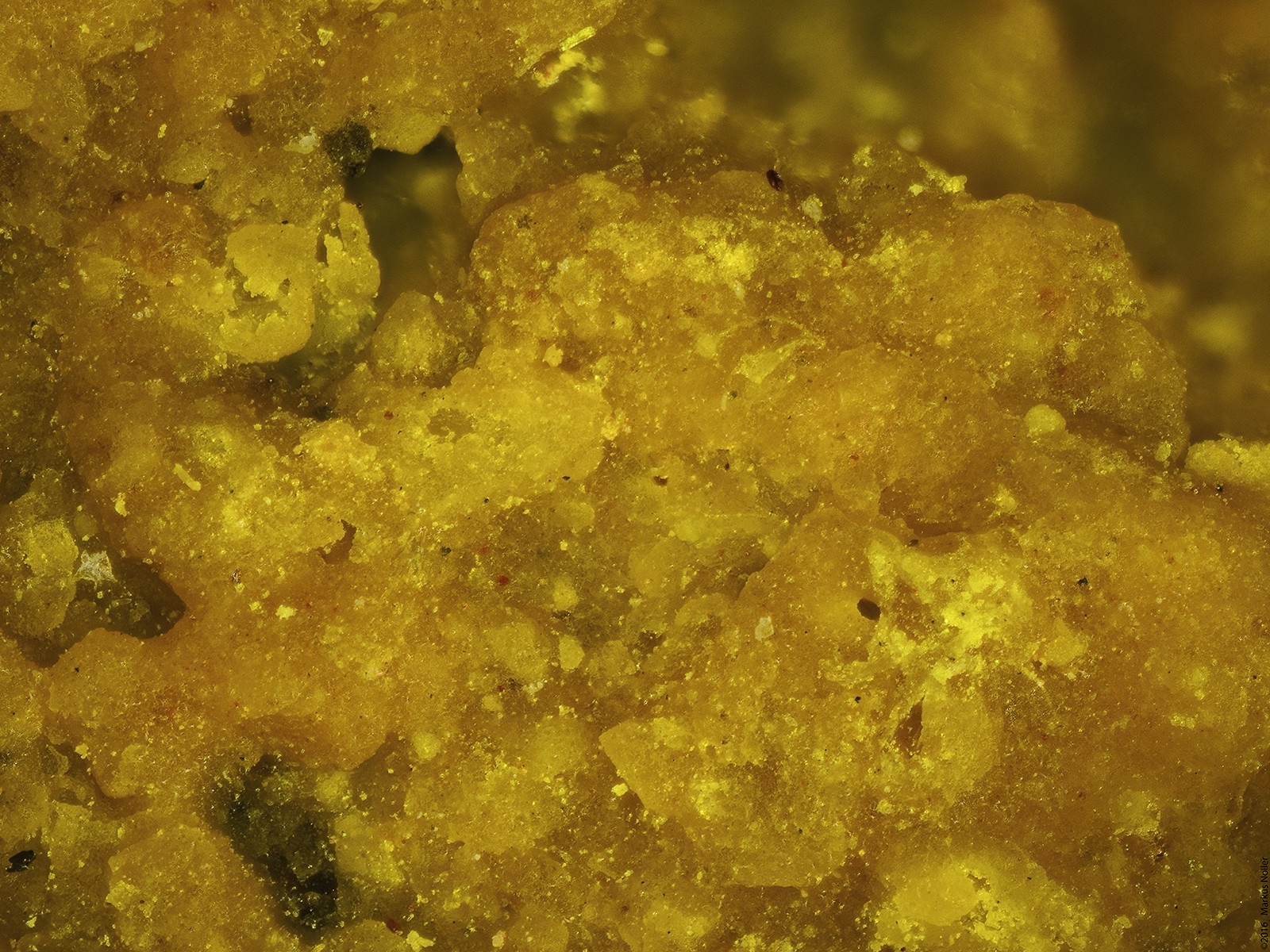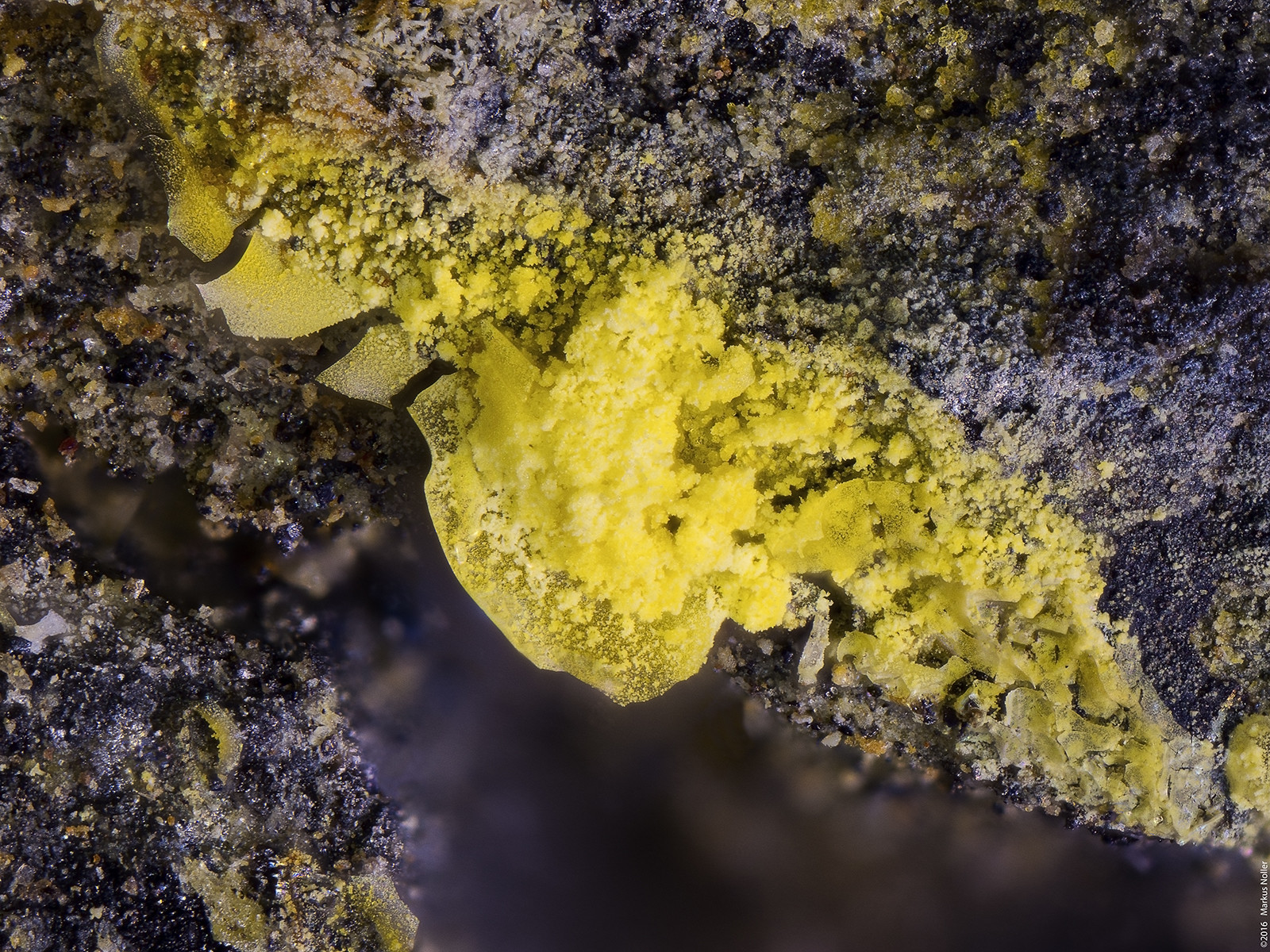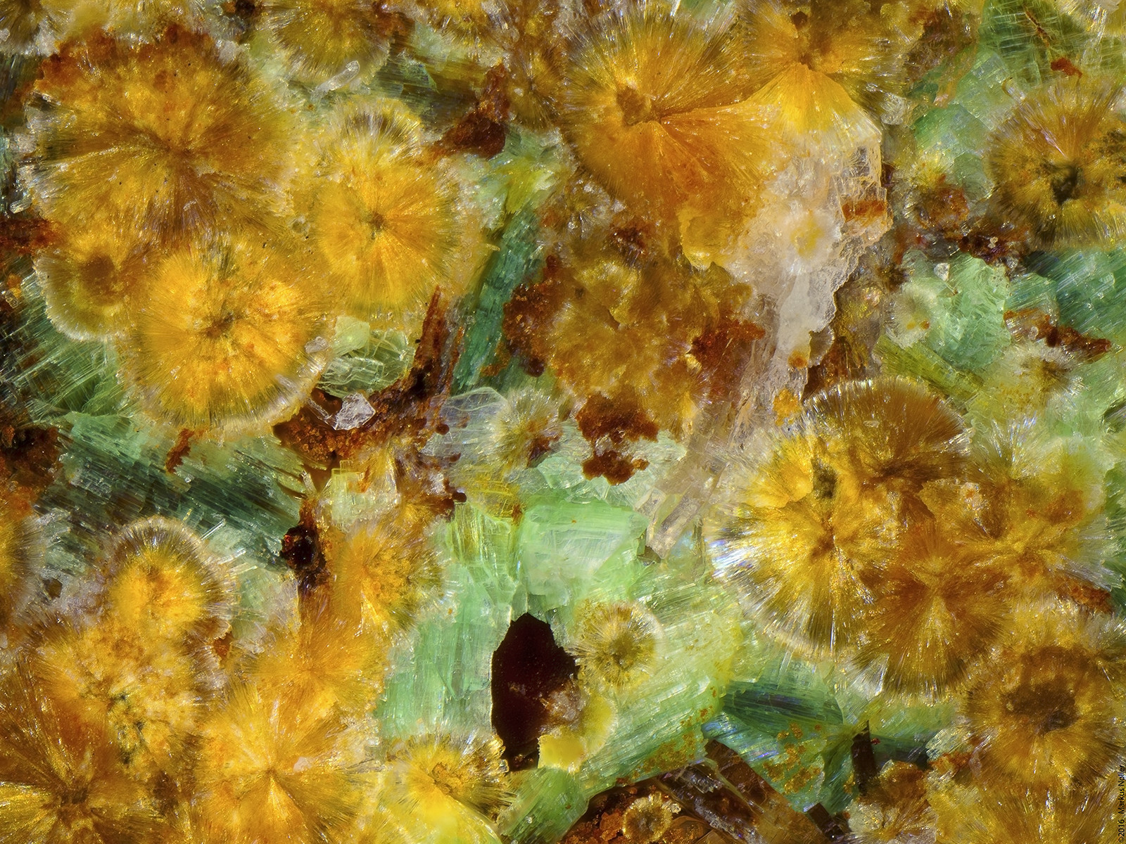 Autunit/Heinrichit xx Mischkristalle mit Uranophan xx von Streuberg/Bergen/Vogtland. Die Regenbogenfarben neben/unter dem Heinrichit kommen durch die Epibeleuchtung mit polarisiertem Licht und zeigt, dass das Material doppelbrechend ist (verm. Quarz). Die unterschiedlichen Farben repräsentieren in diesem Fall verschiedenen Schichtdicken und innere Spannungen. EDX analysiert. Die Bildbreite beträgt ca. 1,6mm mit dem 10er Mitu: