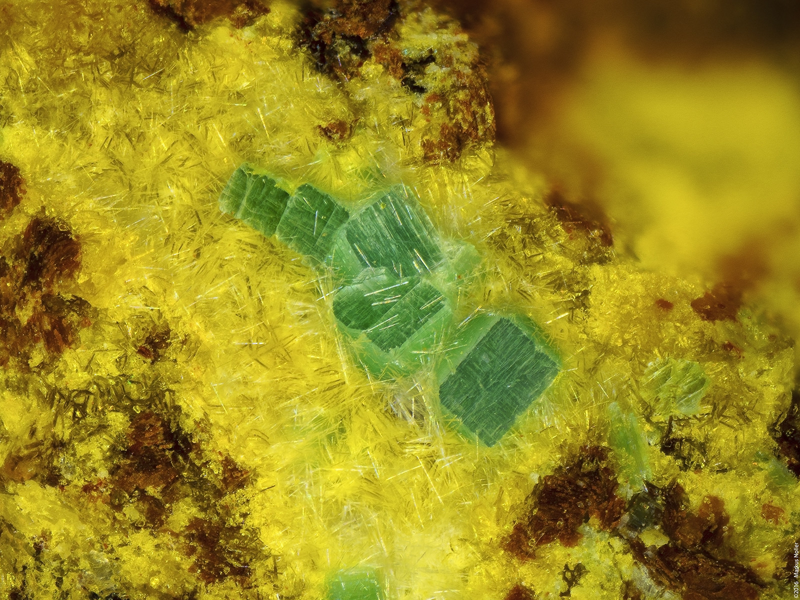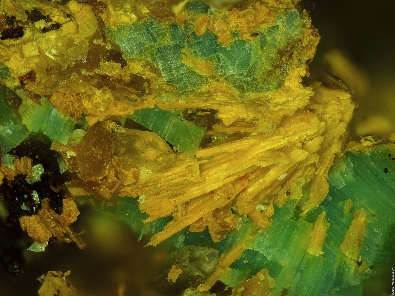 Meta-Ankoleit (grün) mit Chernikovit xx (gelb) vom Stbr. Rockelmann/Schwarzenberg/Erzgebirge. Die Bildbreite beträgt ca. 1,6mm mit dem 10er Mitu: