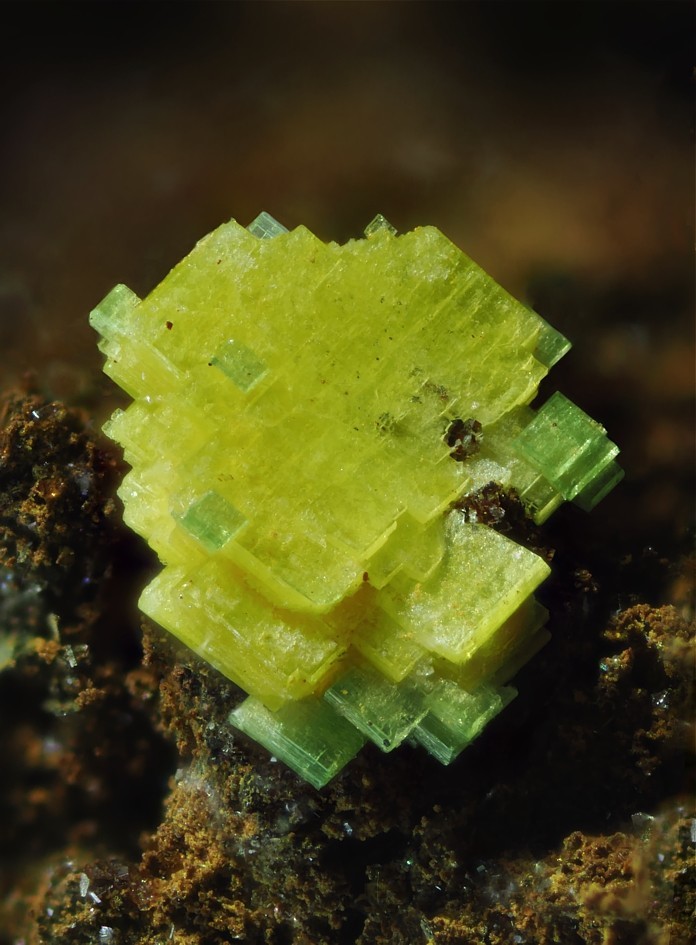 Gelborange, taflige und säulige, gestreifte Billietitkristalle neben kleinen grünen Torbernitkristallen von der der Uranlagerstätte Krunkelbachtal bei Menzenschwand im Schwarzwald. Die Billietitkristalle sind verzwillingt, was man an den einspringenden Winkeln erkennen kann. Bei genauem Hinsehen zeigen sie sogar eine phantomartige Zeichnung, Bildhöhe etwa 2,2 mm.
