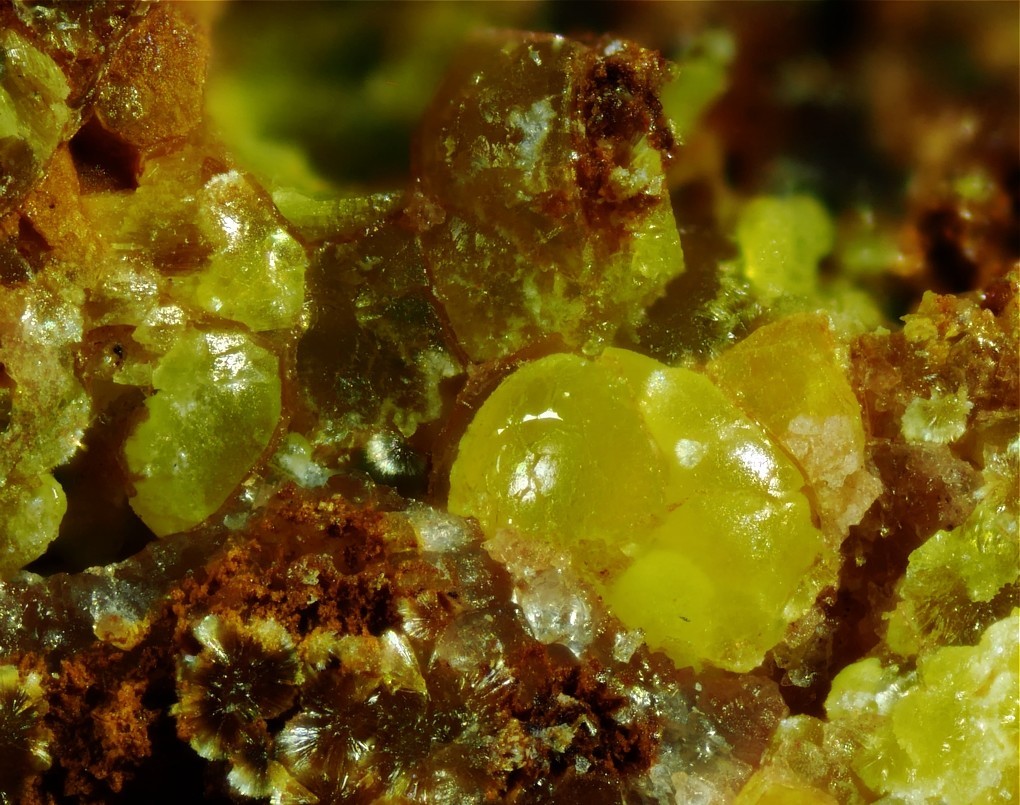 Kugelige, gelbe Aggregate von Uranopilit aus der Uranlagerstätte Krunkelbachtal, Menzenschwand, Schwarzwald. Bildbreite etwa 3 mm. Ex.Coll. Döblin. Riehen, CH.